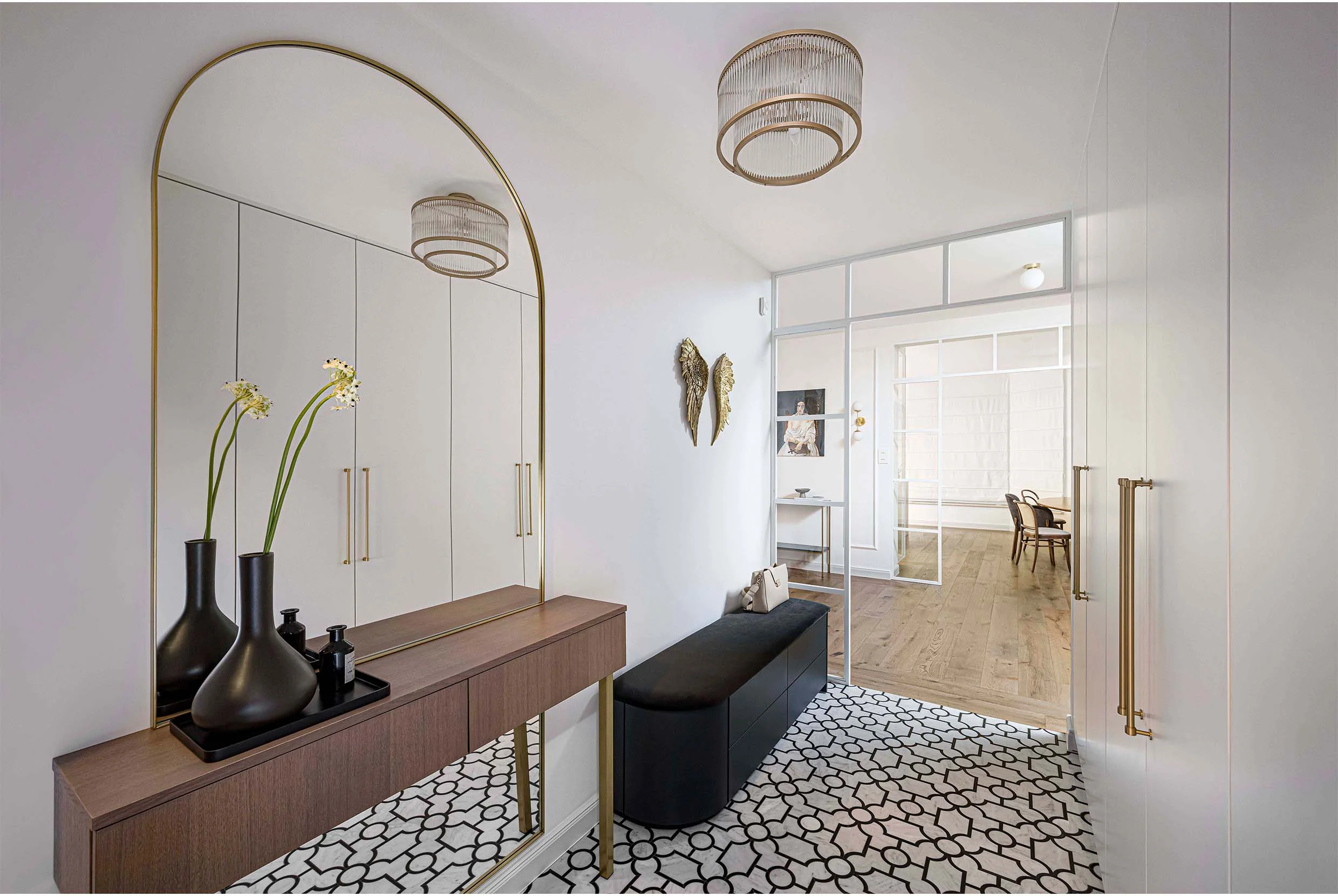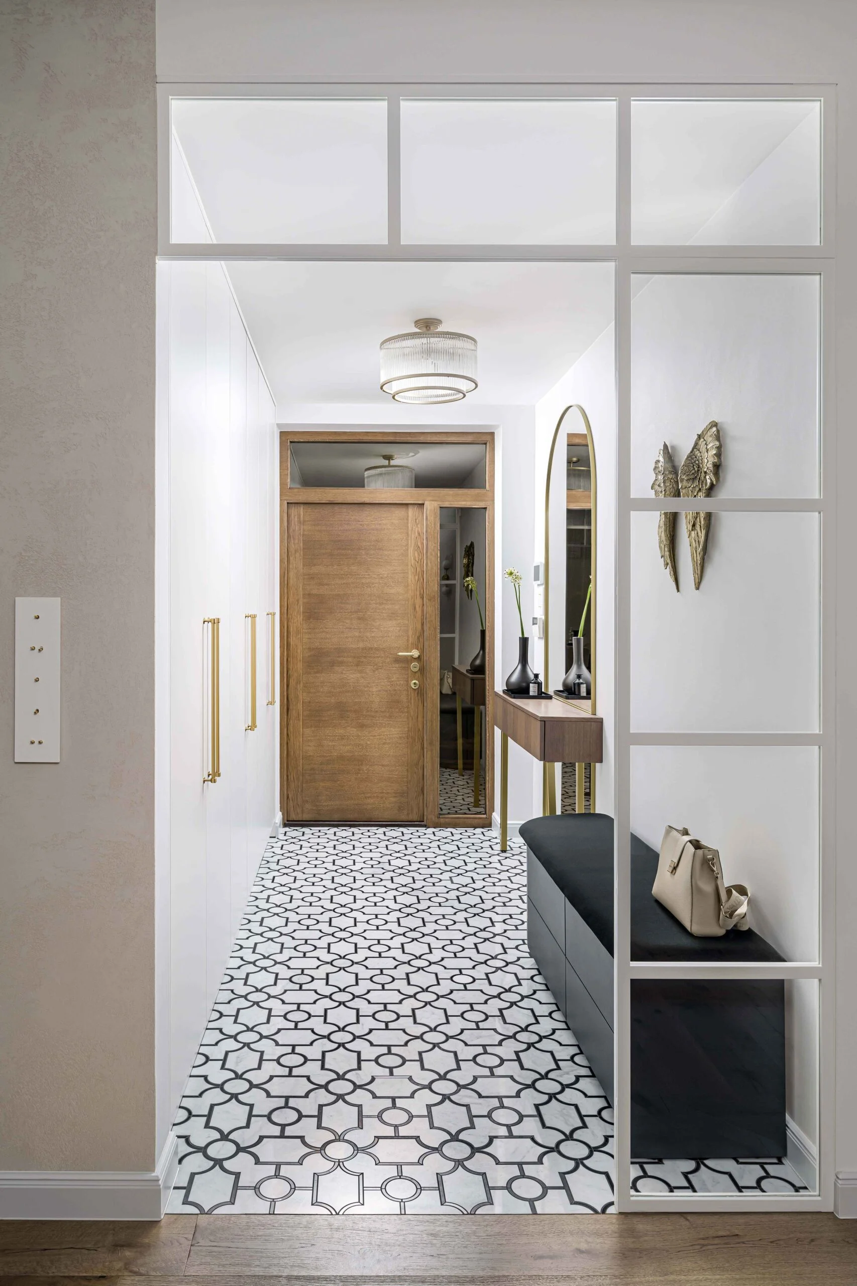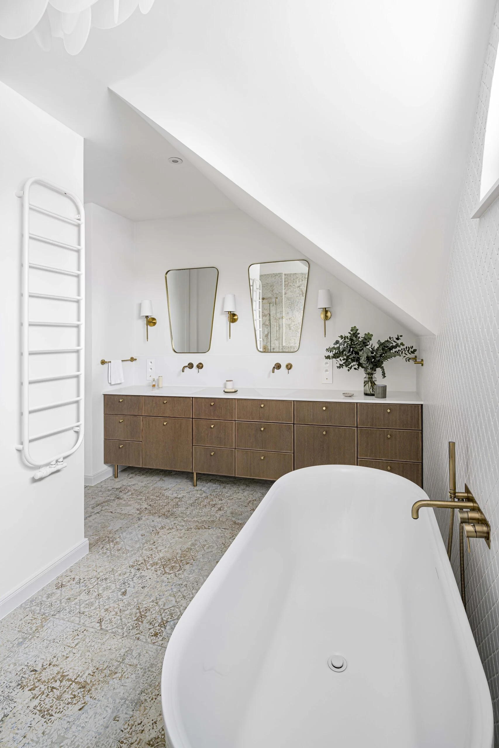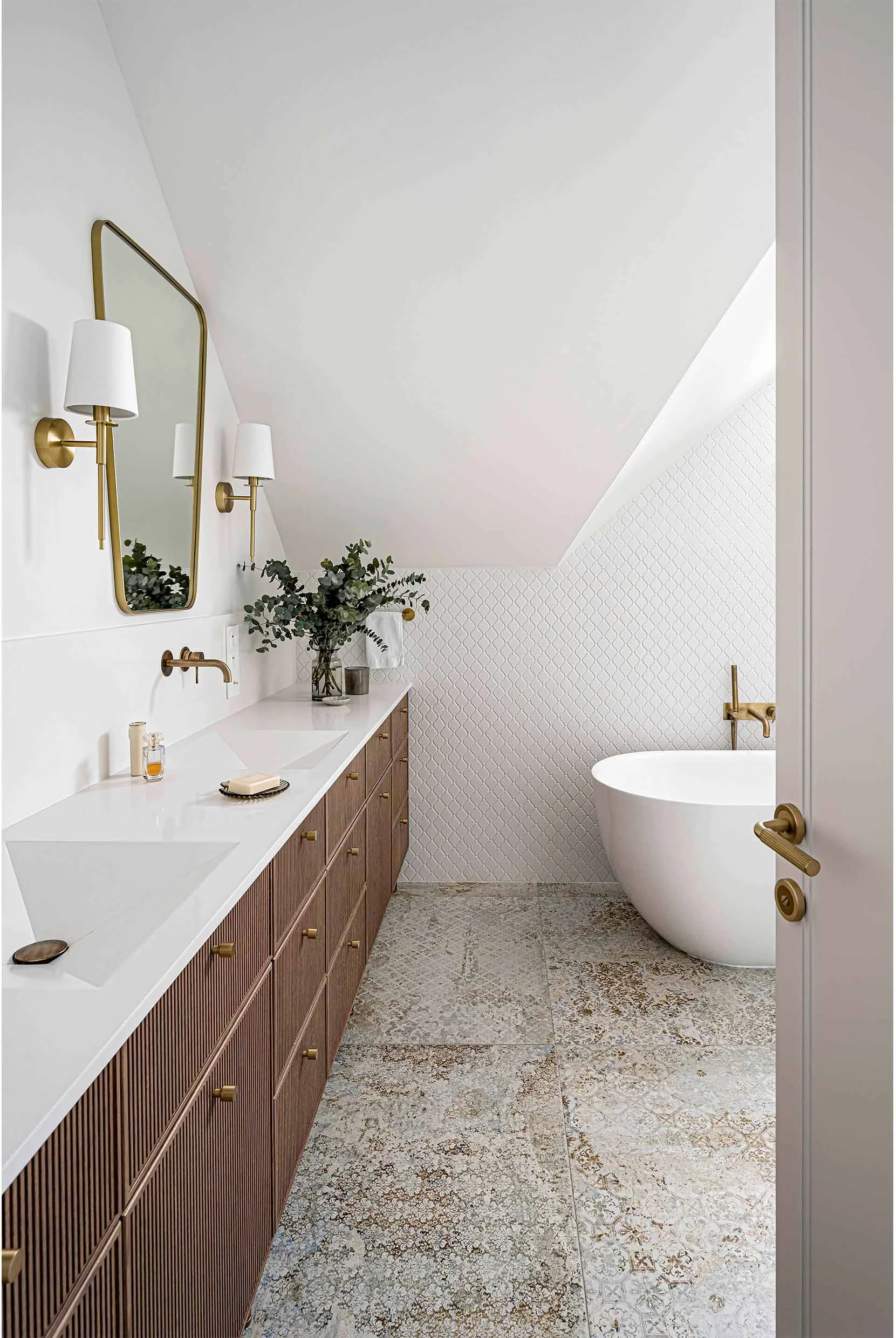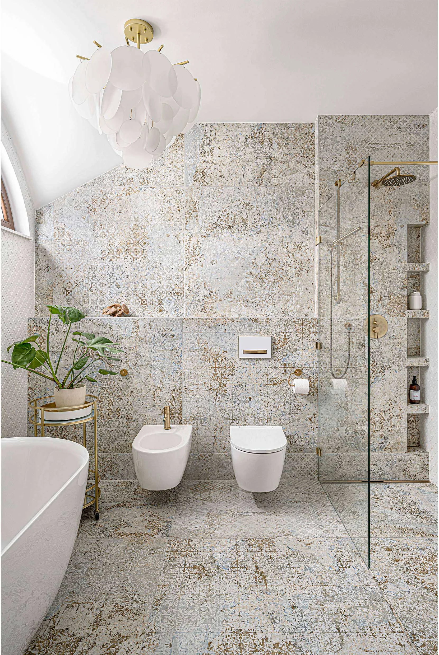 Łazienka główna to pokój kąpielowy- płytka z wzorem mozaiki portugalskiej połączona jest z białą arabeską oraz złotymi detalami. Uzupełnieniem jest drewniana szafka z ryflowanymi frontami .