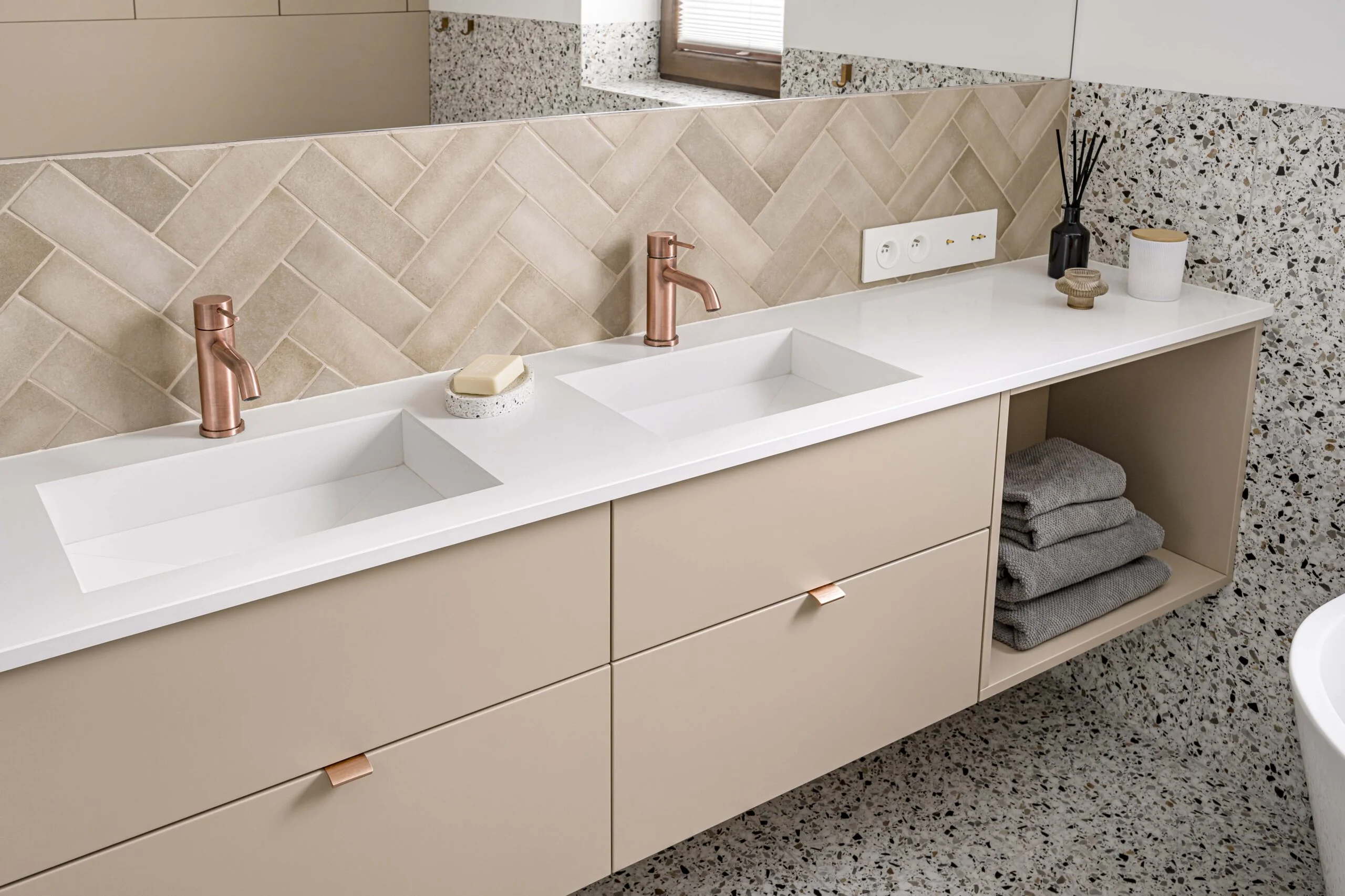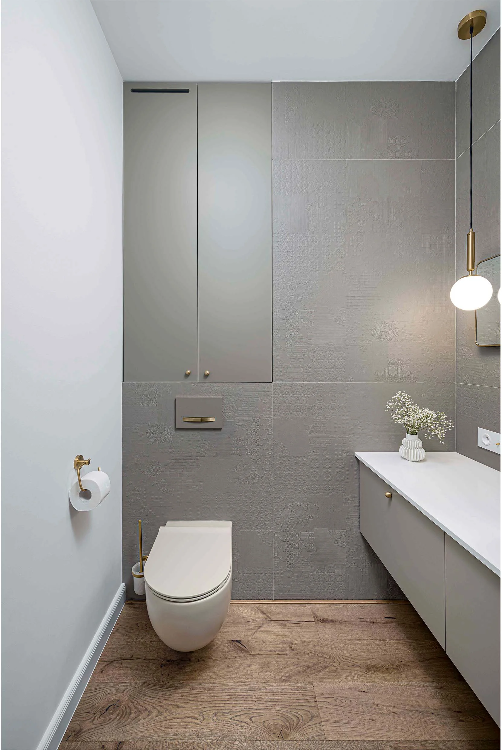 Łazienka dziecięca jest w nieco innej stylistyce- to łagodne połączenie płytek w kolorze beżowym z płytką imitującą terrazzo. Dla odmiany dodatki oraz wykończenie kabiny prysznicowej są w kolorze miedzi.