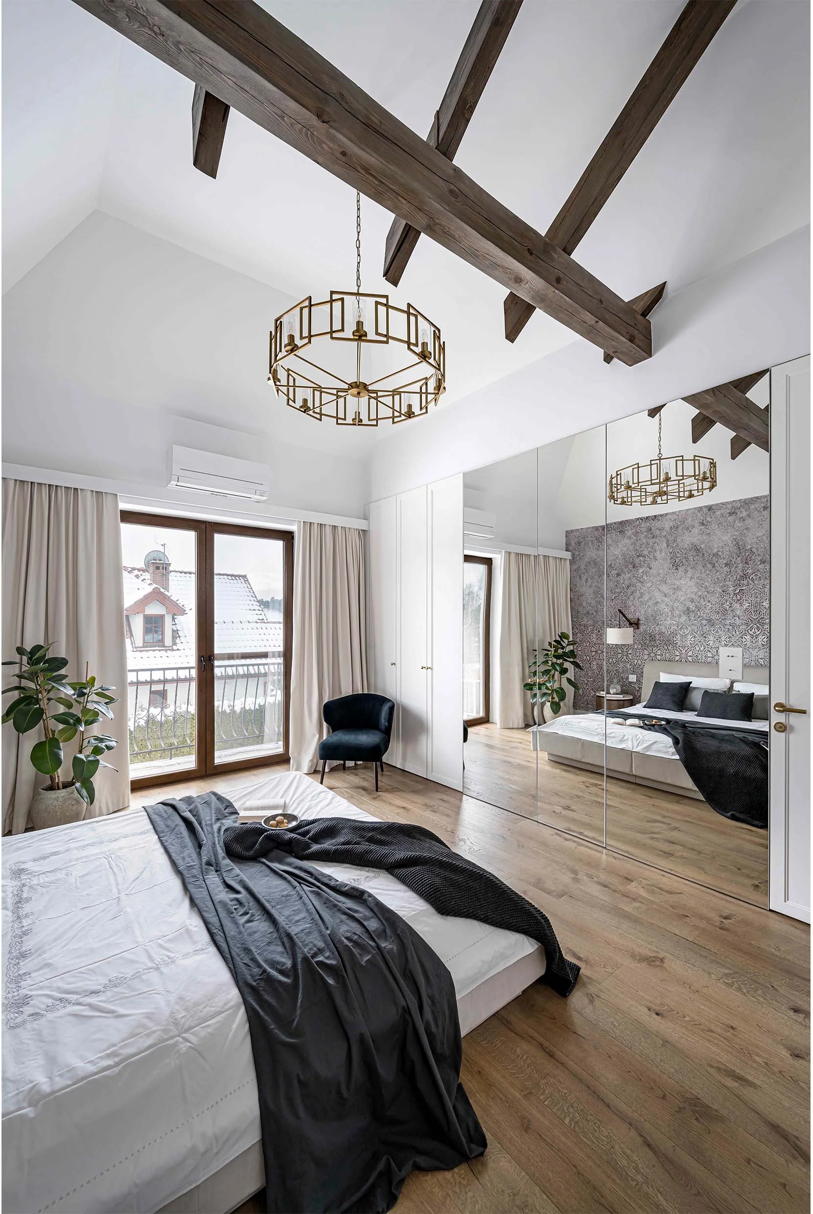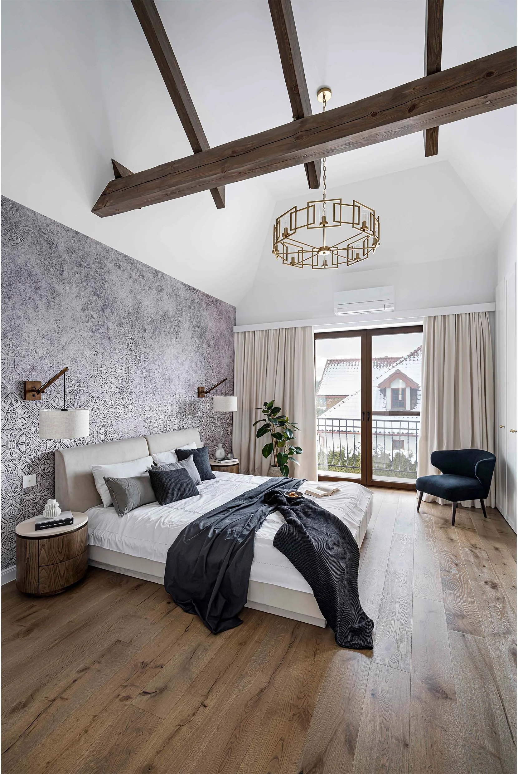 Strefa sypialni głównej na piętrze to przestrzeń totalnie eklektyczna łącząca wspomniane wyżej elementy. Oryginalne belki podkreślają charakter stylu.