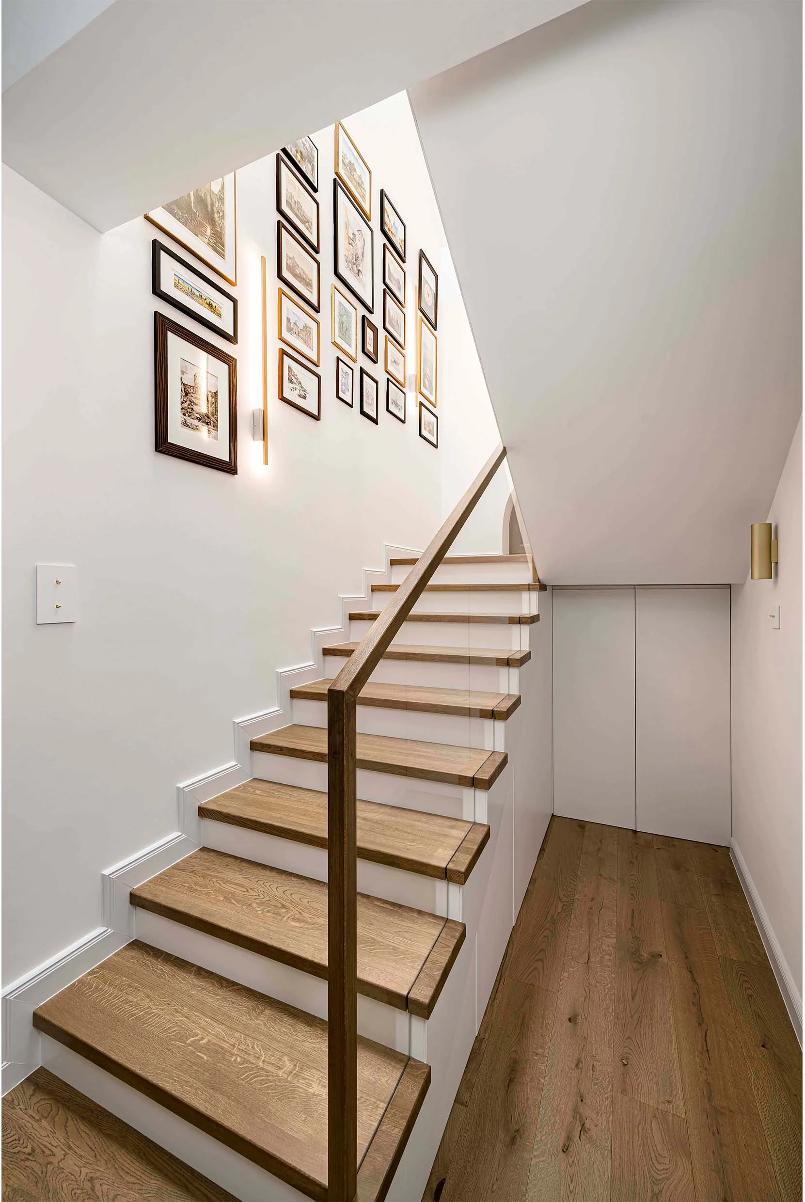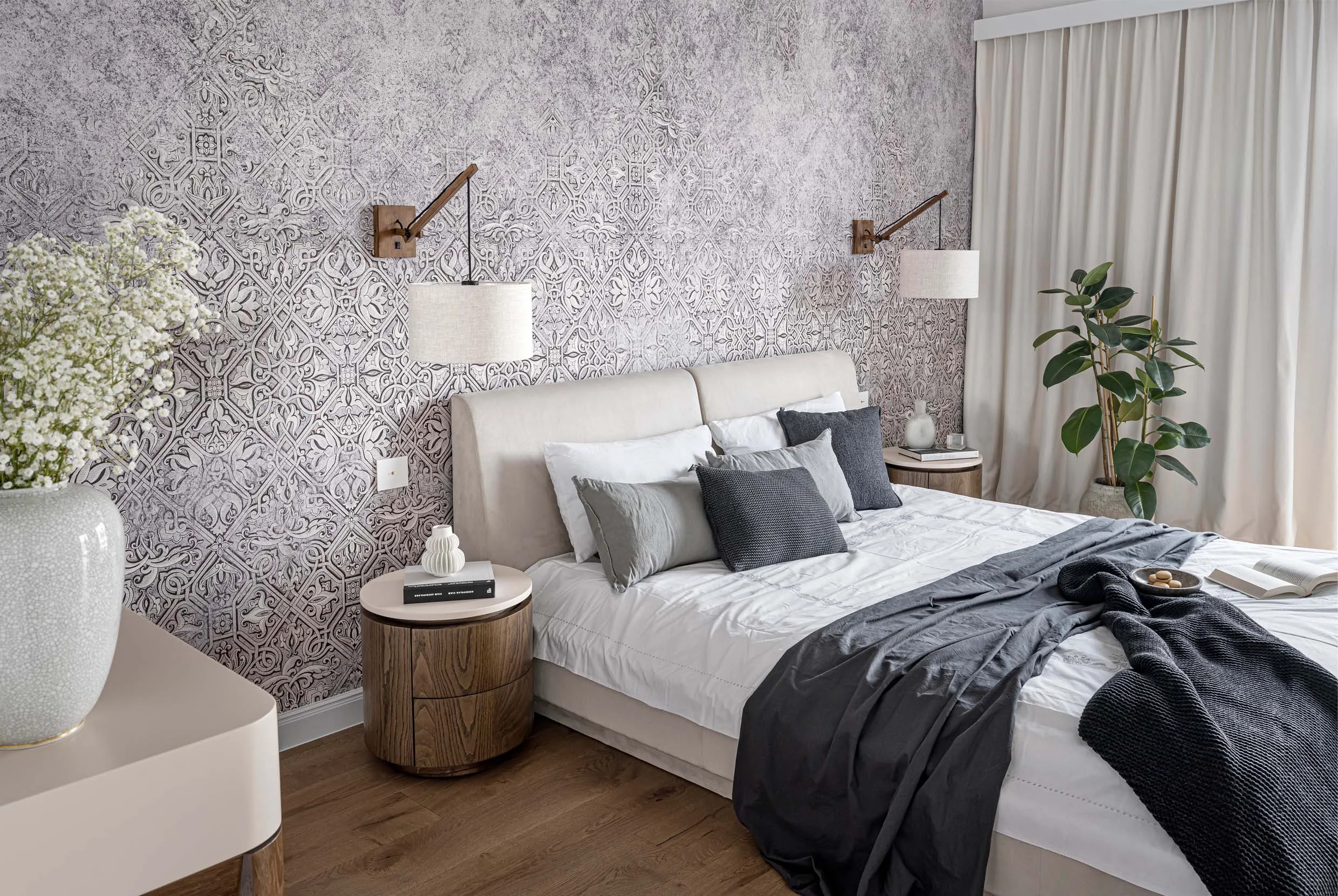 140-metrowy dom pod Warszawą został zaprojektowany dla rodziny czteroosobowej. Tutaj bogactwo struktur przeplata się z kolorami natury oraz biżuteryjnością dodatków. Dominujące materiały to drewno, które pojawiło się na podłodze oraz w postaci mebli wolnostojących, tynk strukturalny , który zdobi ścianę w holu oraz salonie, a także tapeta strukturalna w części jadalni oraz na klatce schodowej. Istotna jest także metaloplastyka- przepierzenie pomiędzy wiatrołapem, holem oraz aneksem to ważny akcent funkcjonalny oraz wizualny przestrzeni. Oświetlenie drewniane nad owalnym stołem nawiązuje do stylistyki farmhouse, a dodatki i pozostałe oświetlenie jest w tonach szczotkowanego złota- dzięki czemu całość nabiera elegancji.