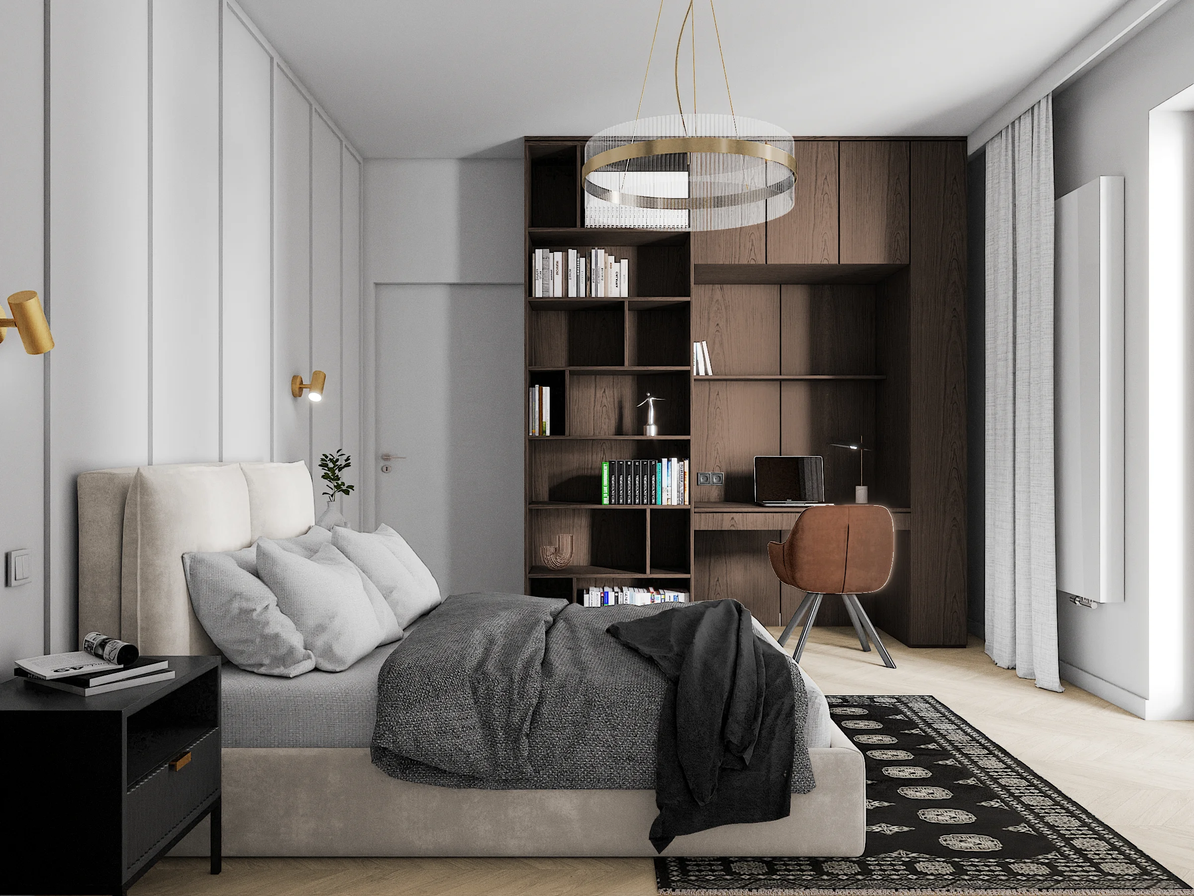 Sypialnia to kontynuacja kolorystyczna – fornirowana zabudowa będąca strefą biurową to mocny element, natomiast strefa garderoby to zabudowa w pełni pokryta lustrem. Za łóżkiem tapicerowanym pojawił się delikatny wzór ze sztukaterii.