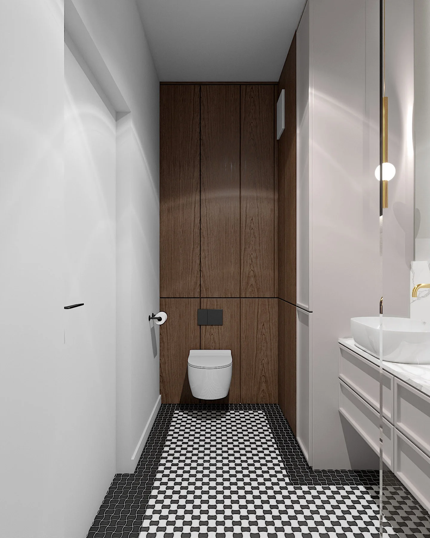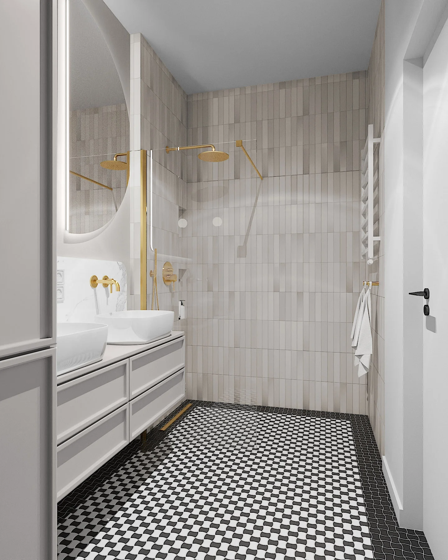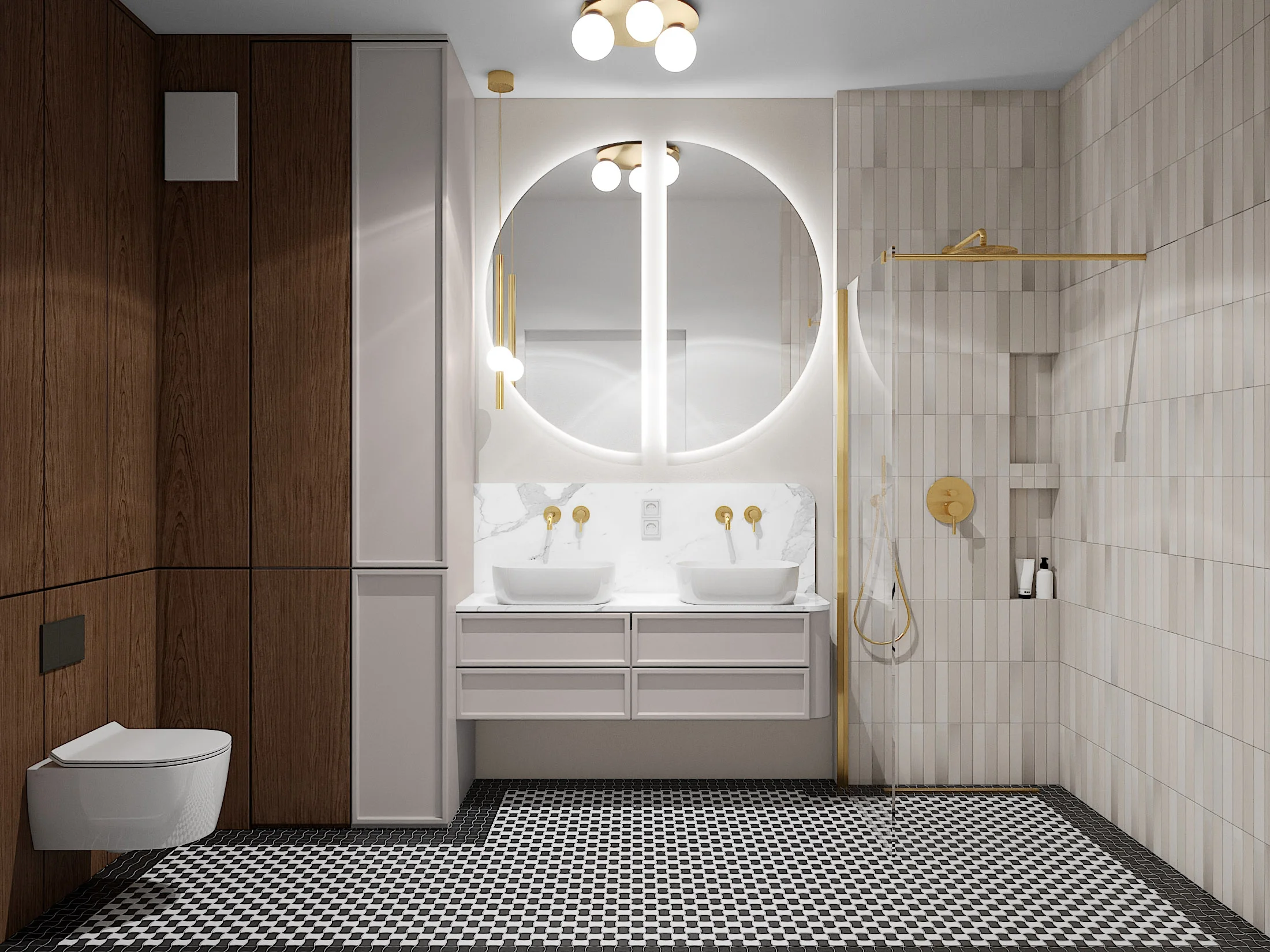 z „gorsecików warszawskich”. Dodatkowo pojawiły się tutaj beżowe płytki w strefie prysznica o lekkiej strukturze 3d. Uzupełnieniem jest fornirowana oraz beżowa zabudowa stolarska oraz złote elementy szczotkowane, które dodają elegancji.