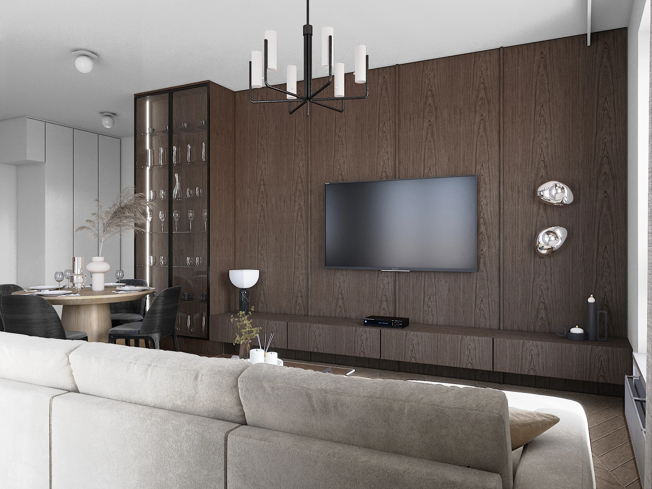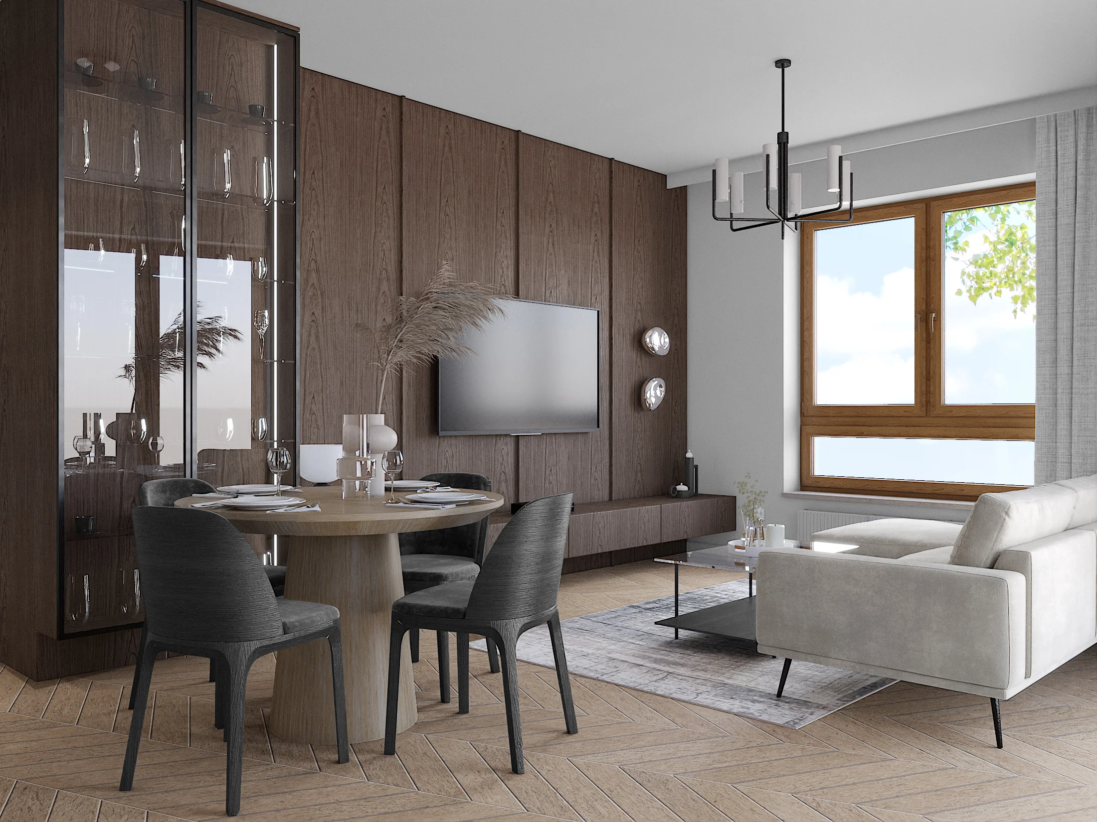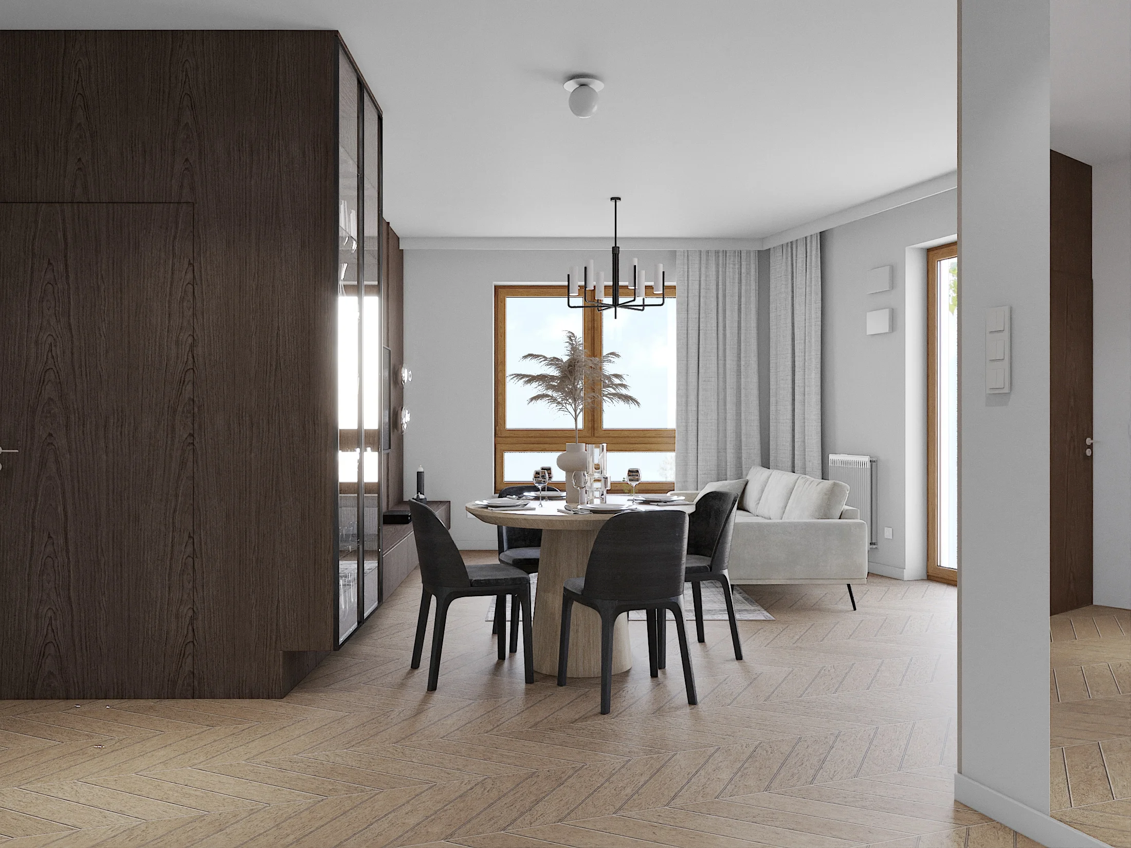 Założeniem było stworzenie przestrzeni o sporej ilości drewna- natomiast w nowoczesnej i eleganckiej formie. Na podłodze pojawiła się jodełka francuska w jasnym tonie. Mocnym akcentem przestrzeni otwartej jest zabudowa fornirowana na ścianie w holu i telewizyjnej, która skrywa drzwi do pokoju gościnnego, a także witrynę oraz szafkę telewizyjną.