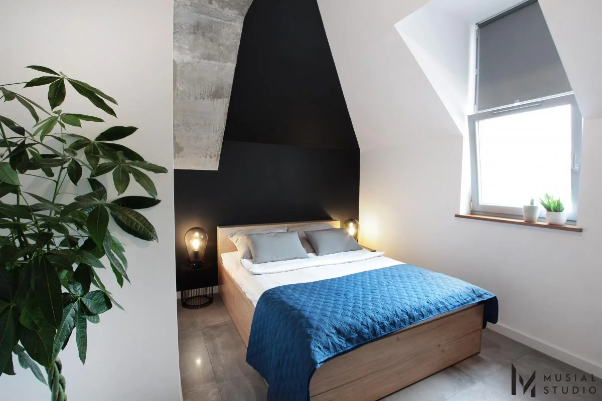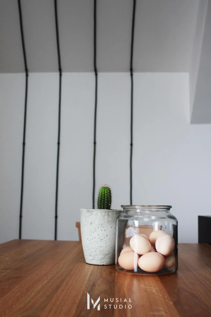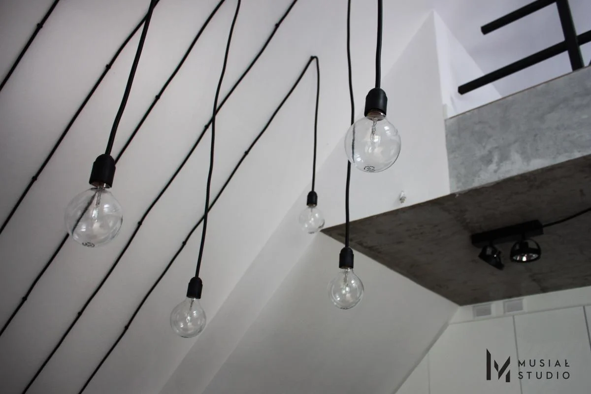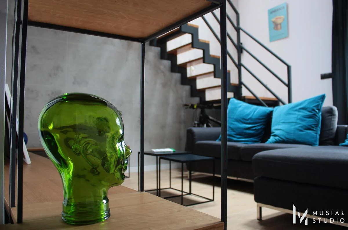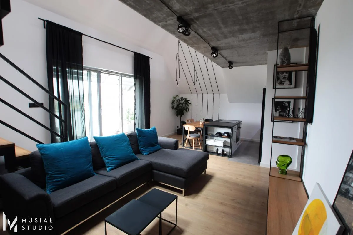 Realizacaj projektu mieszkania w stylu industrialnym – beton , stalowe elementy, kable biegnące po ścianach i sufitach – to motywy przewodnie tej przestrzeni. Dopełnieniem jest podłoga w ciepłym tonie, rośliny i dodatki.