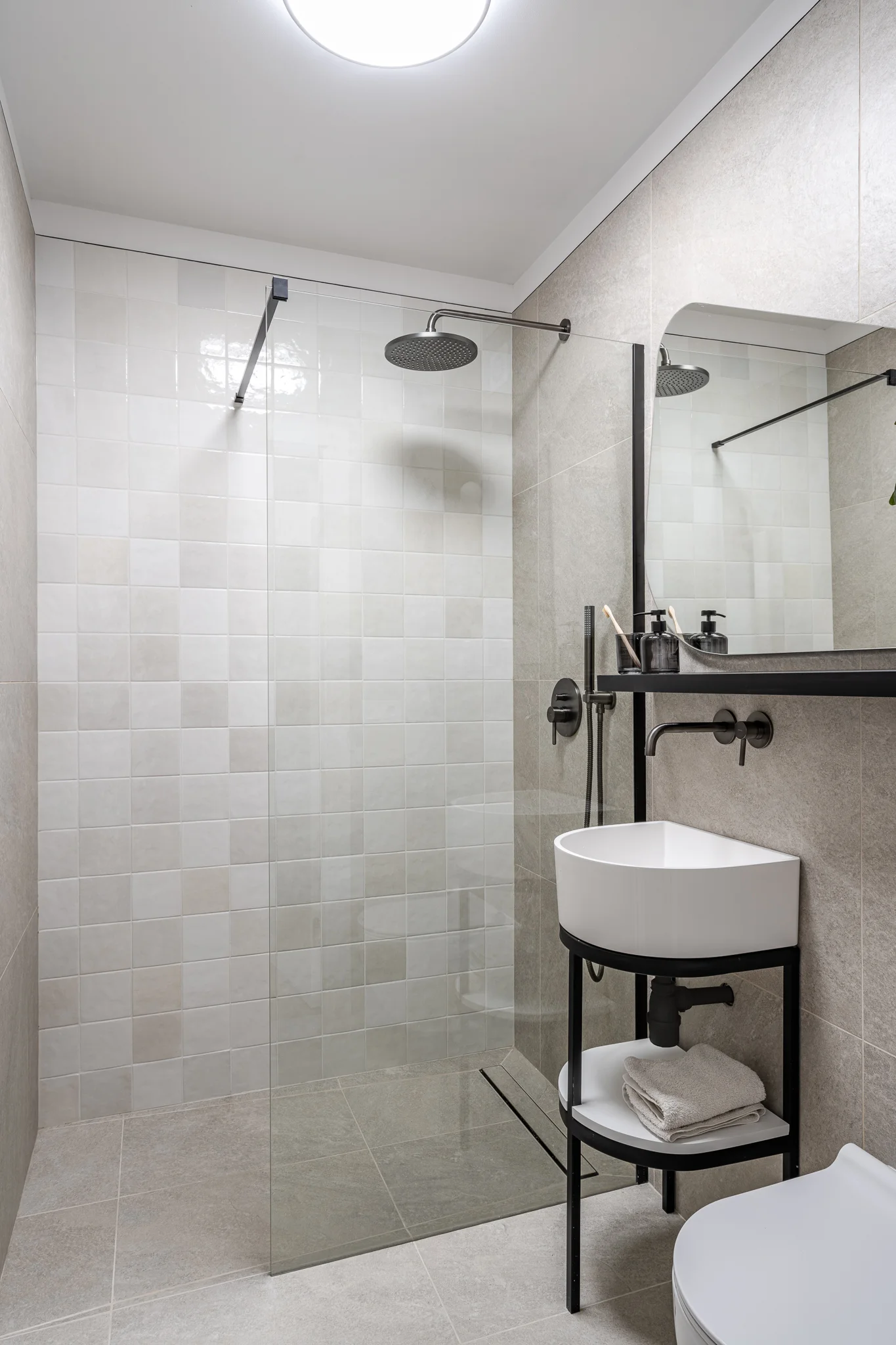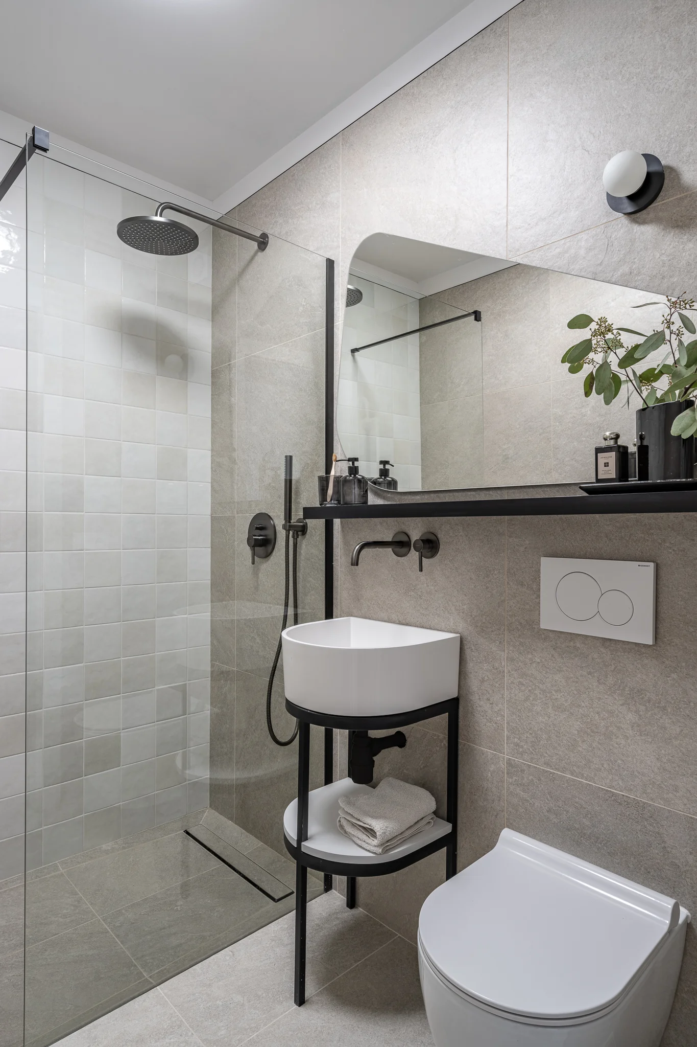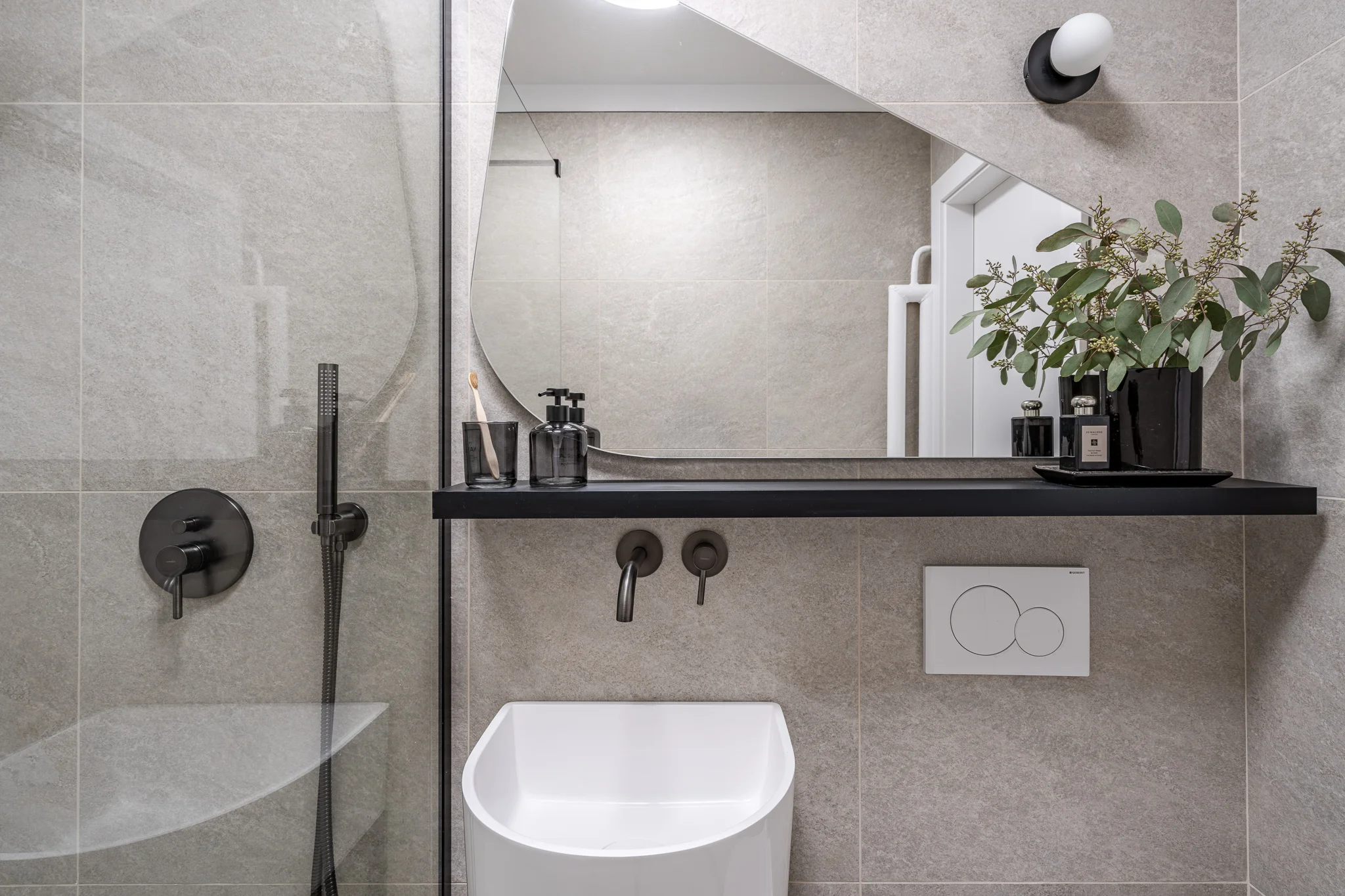 Łazienka to minimalistyczne połączenie płytek o strukturze kamienia z dekorem w postaci stylizowanej płytki, która pojawiła się w kuchni. Całość dopełnia organiczne lustro oraz ciemne dodatki i armatura.
