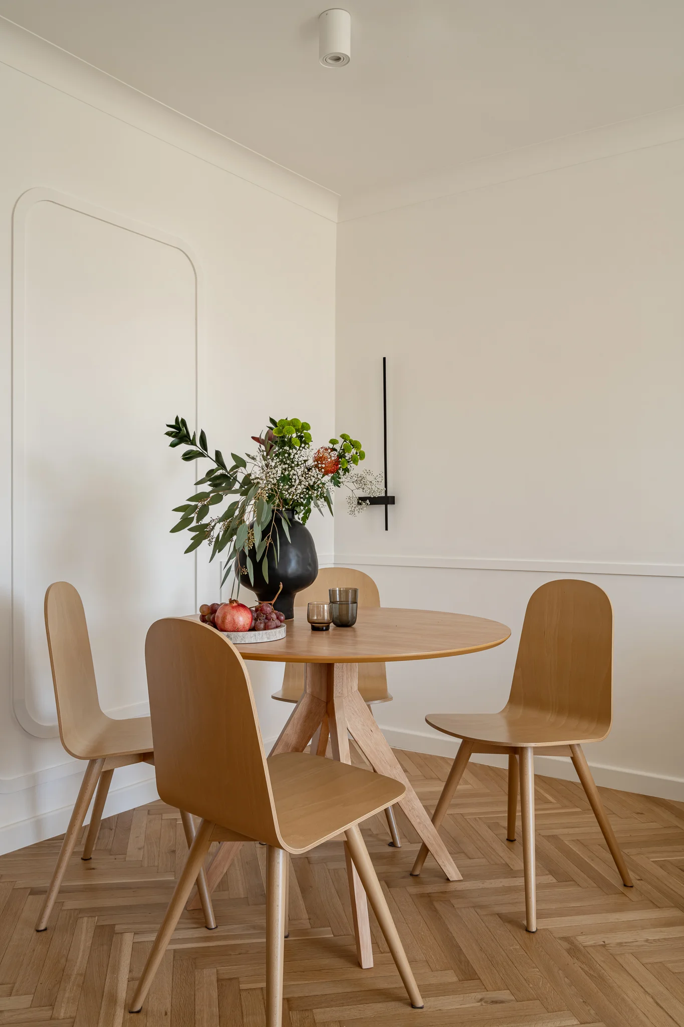 Na białych ścianach została położona sztukateria w autorskim wzorze, łącząc kąty ostre z obłymi formami. Jasne pomieszczenie jest uzupełnione ciemnymi dodatkami, które przełamują delikatne połączenie drewna i bieli.