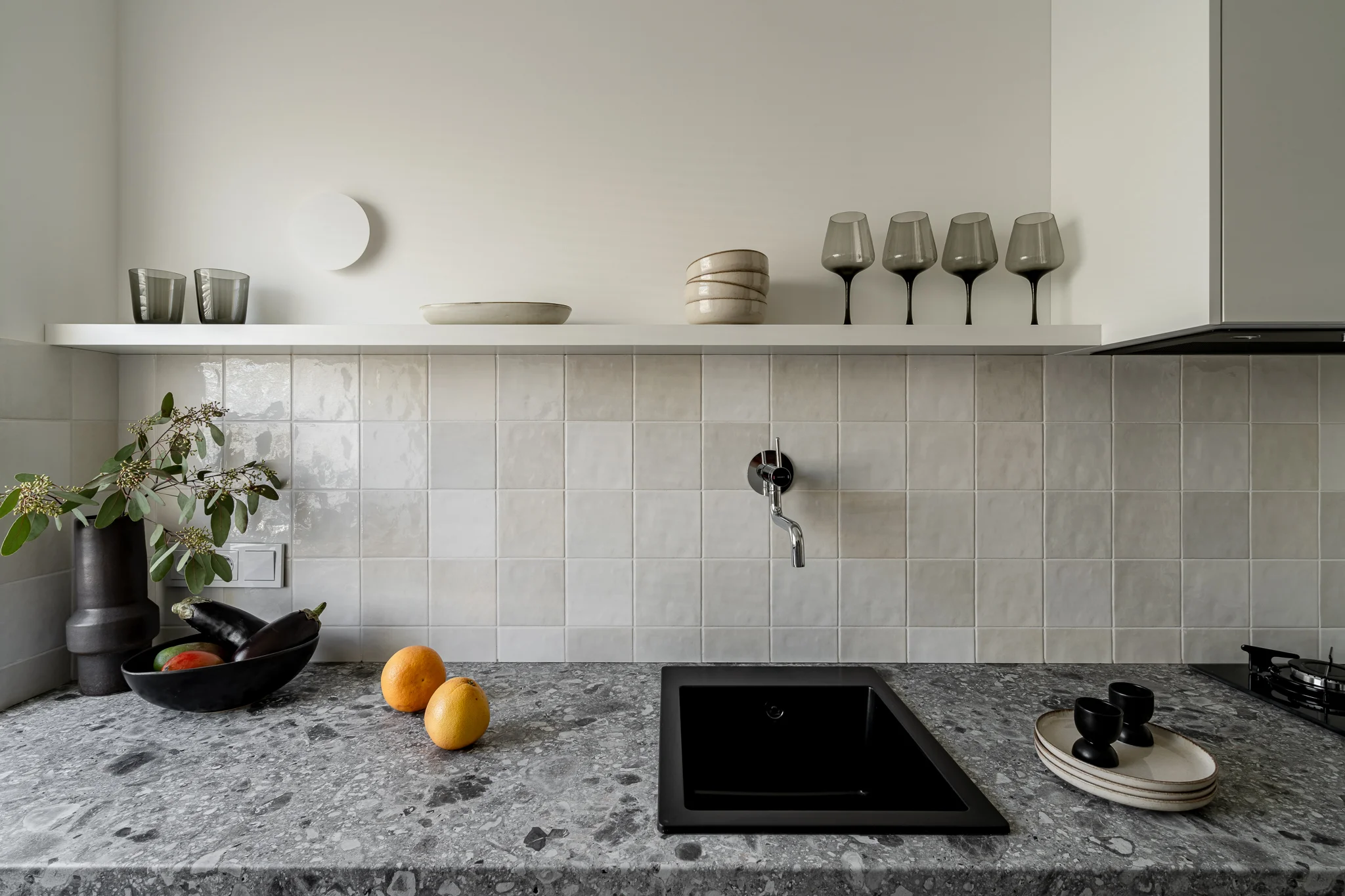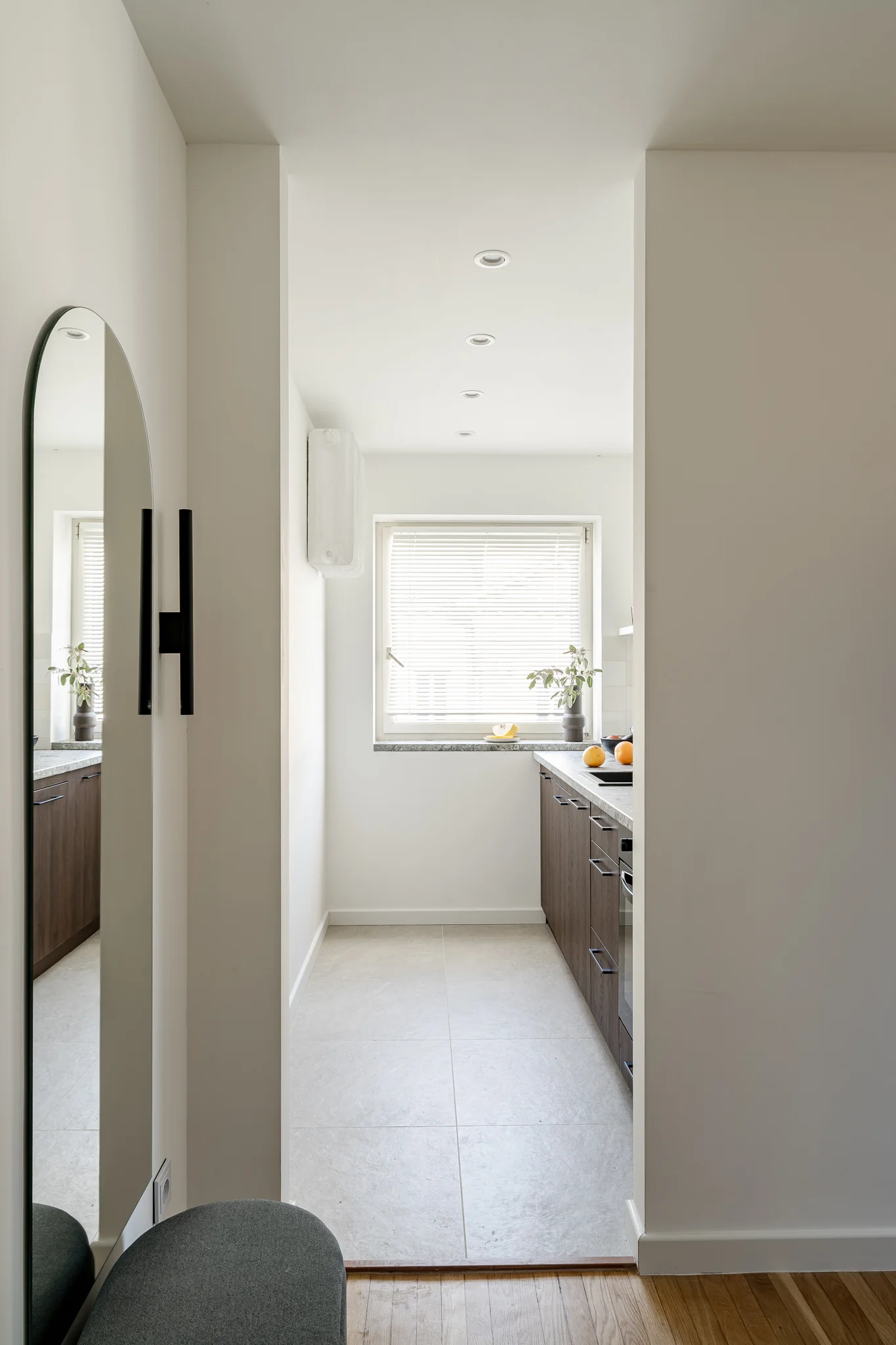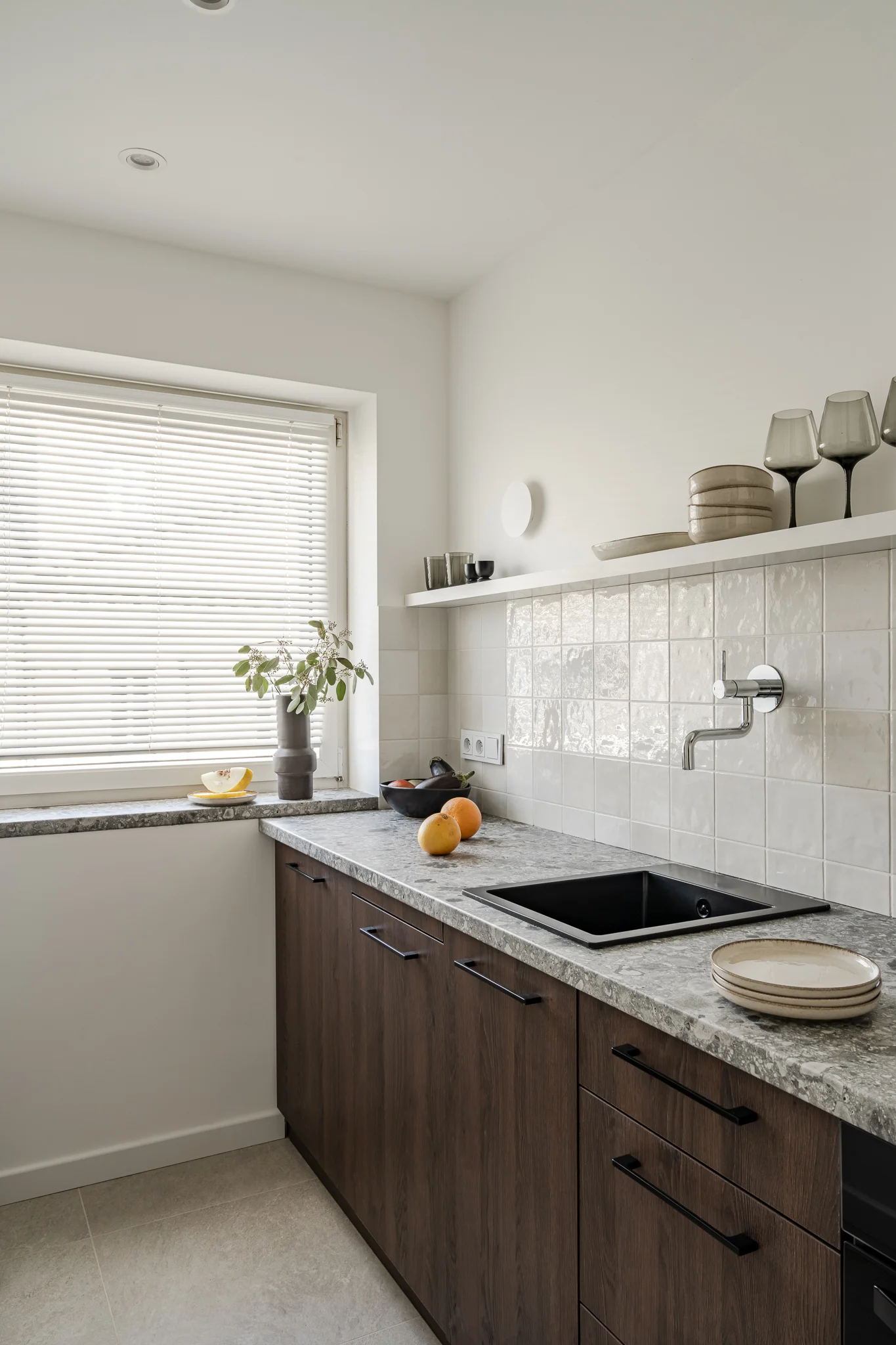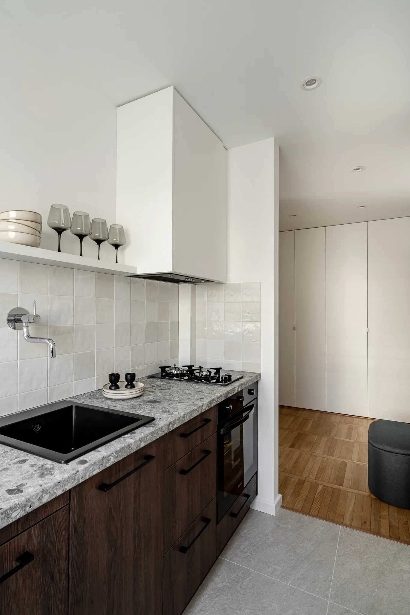 Kuchnia to osobne pomieszczenie. Minimalistyczna zabudowa w wykończeniu ciemnego drewna połączona jest z blatem imitującym terazzo oraz stylizowanymi płytkami.