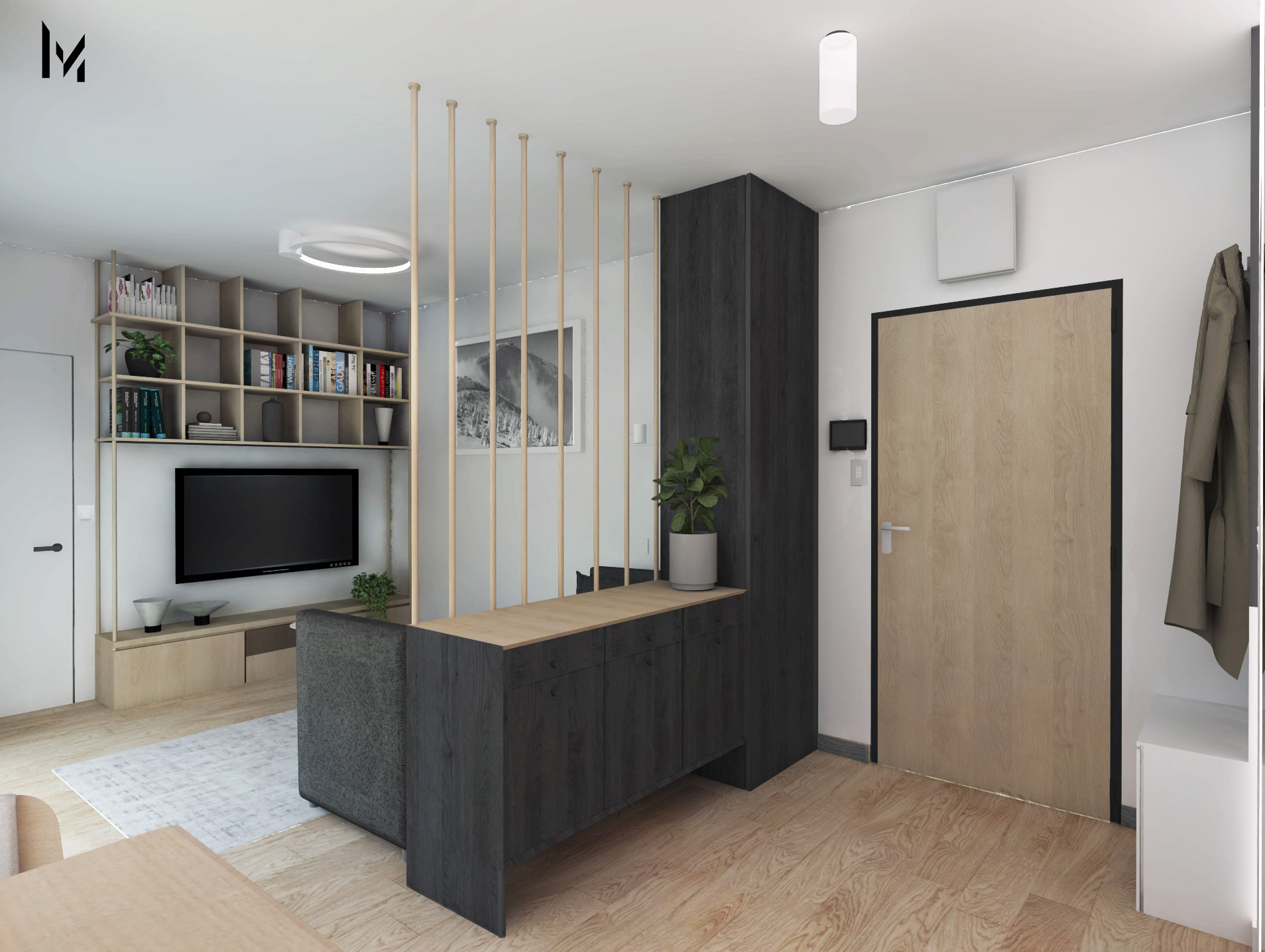 Wydzielona strefa aneksu to połączenie bieli płyty drewnopodobnej w ciemnym tonie, która dobrze kontrastuje z podłogą drewnianą . Strefa wejścia została optycznie wydzielona od strefy pokoju dziennego ścianką ażurową oraz funkcjonalną komodą.