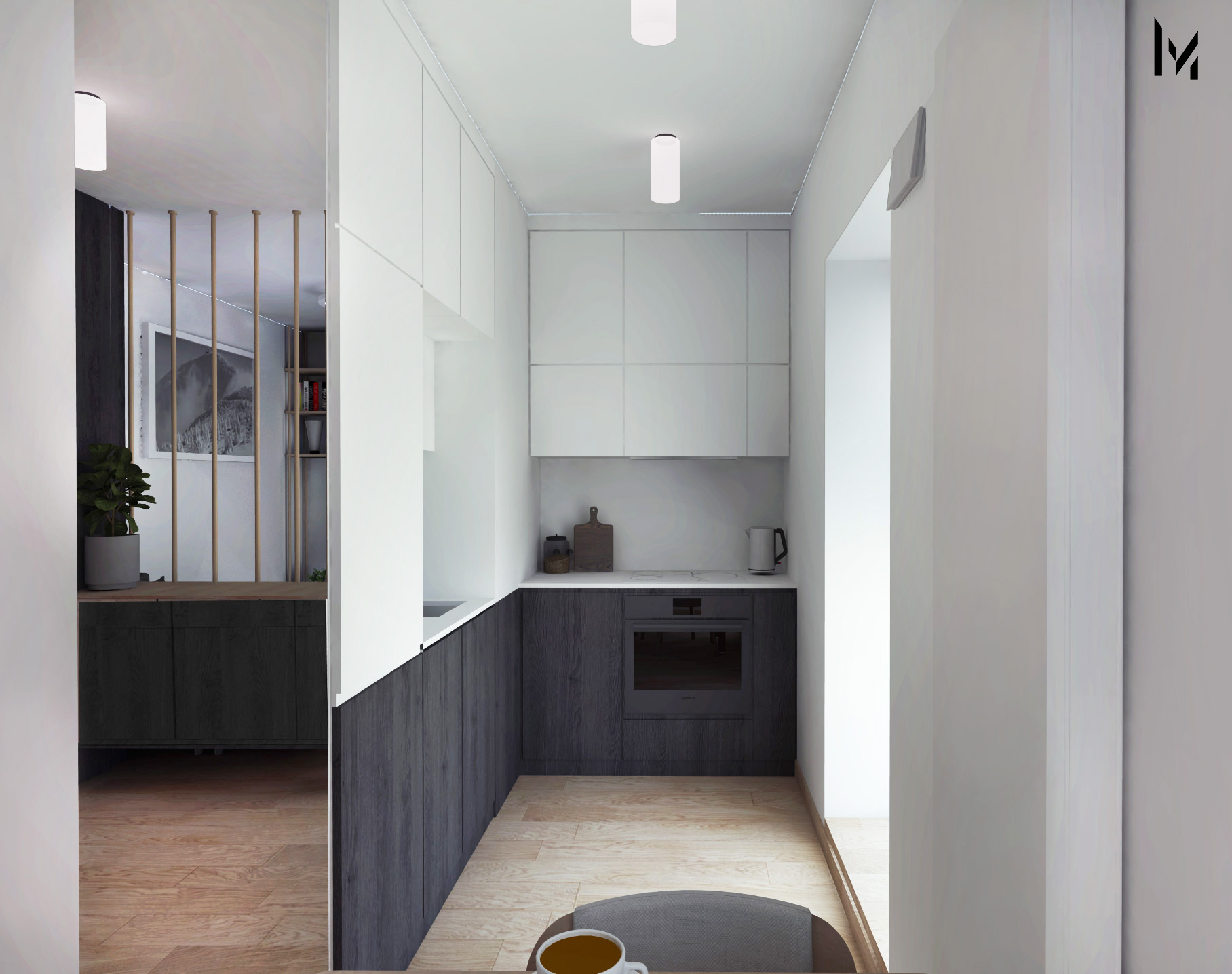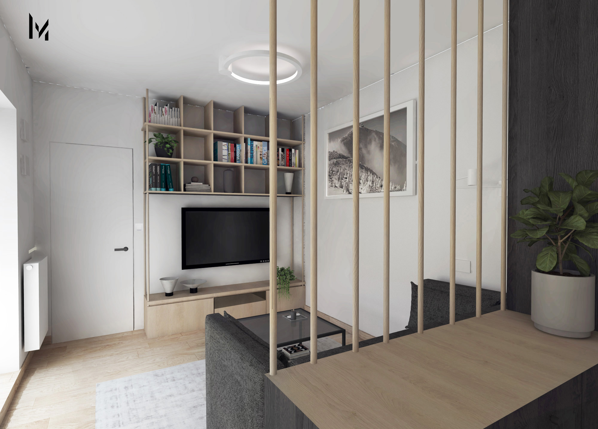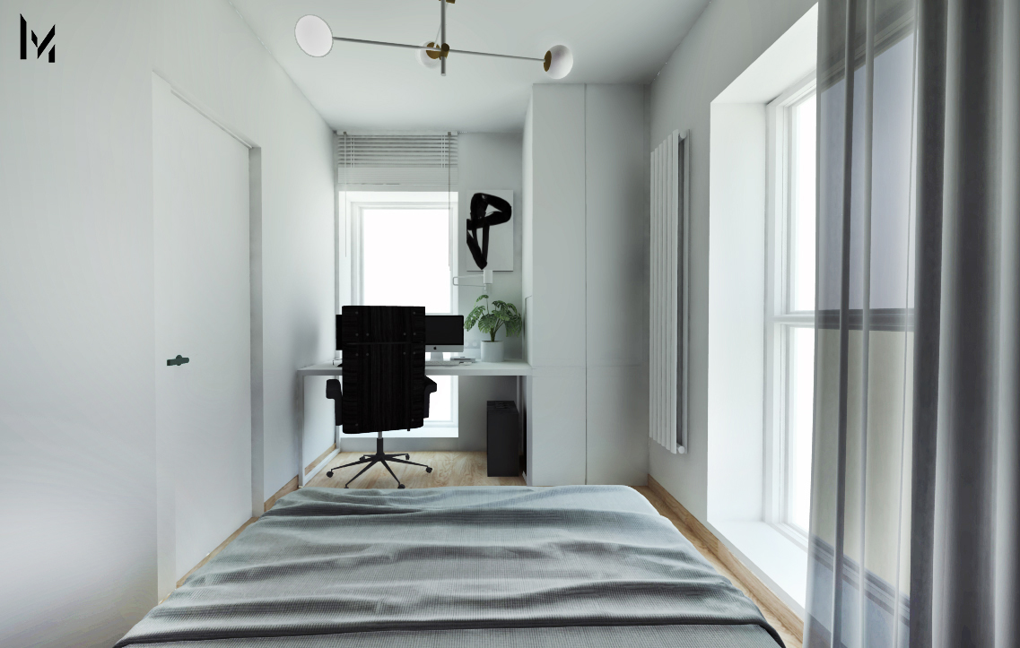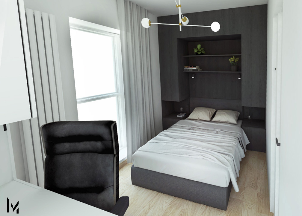 Strefa wypoczynkowa to sofa, która współgra z zabudową holu, oraz delikatny regał, kolorystycznie dobrany do odcieni drewna na podłodze. Ukryte drzwi prowadzą do sypialni, która jest spójna i podzielona na dwie strefy. Ciemna w płycie drewnopodobnej wydziela strefę sypialni, natomiast jasna, biała strona wydziela strefę do pracy.