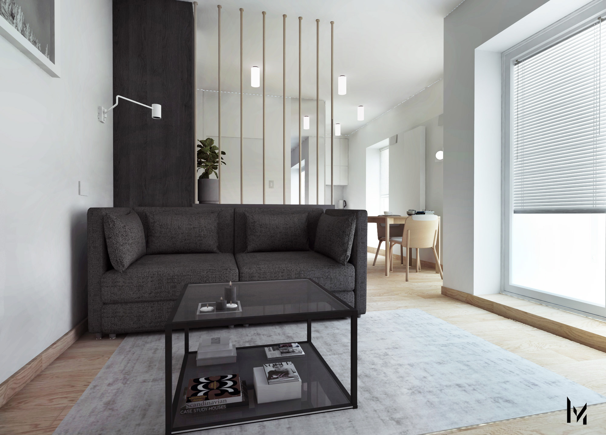 Koncepcja aranżacyjna zakładała określoną gamę kolorystyczną, ponadczasową oraz spójną : drewnianą podłogę ze sporą ilością bieli a także kontrastową płytą antracytową.