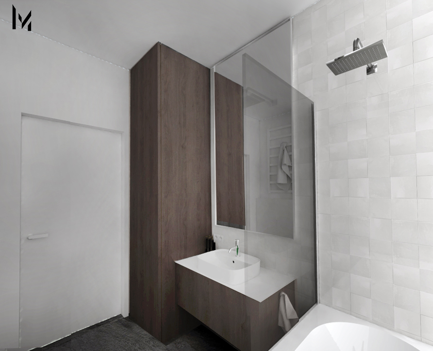 Łazienka to połączenie płytek antracytowych o strukturze kamienia , oraz bazowych płytek dekoracyjnych ,białych. Dopełnieniem jest ciemna zabudowa stolarska z okleiny drewnopodobnej o mocnej strukturze drewna.