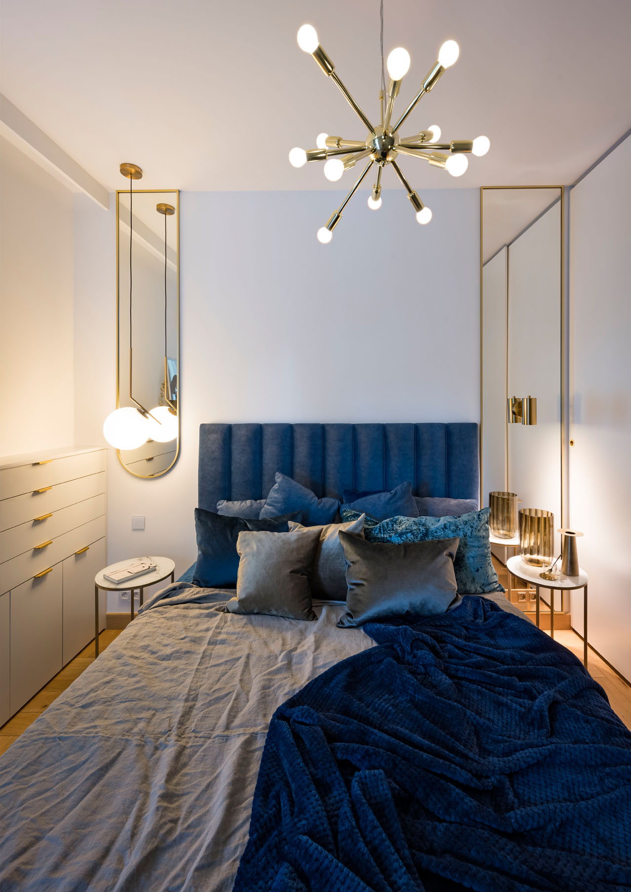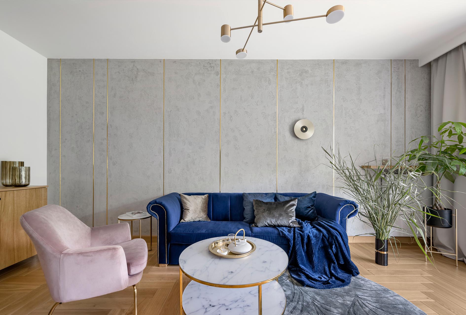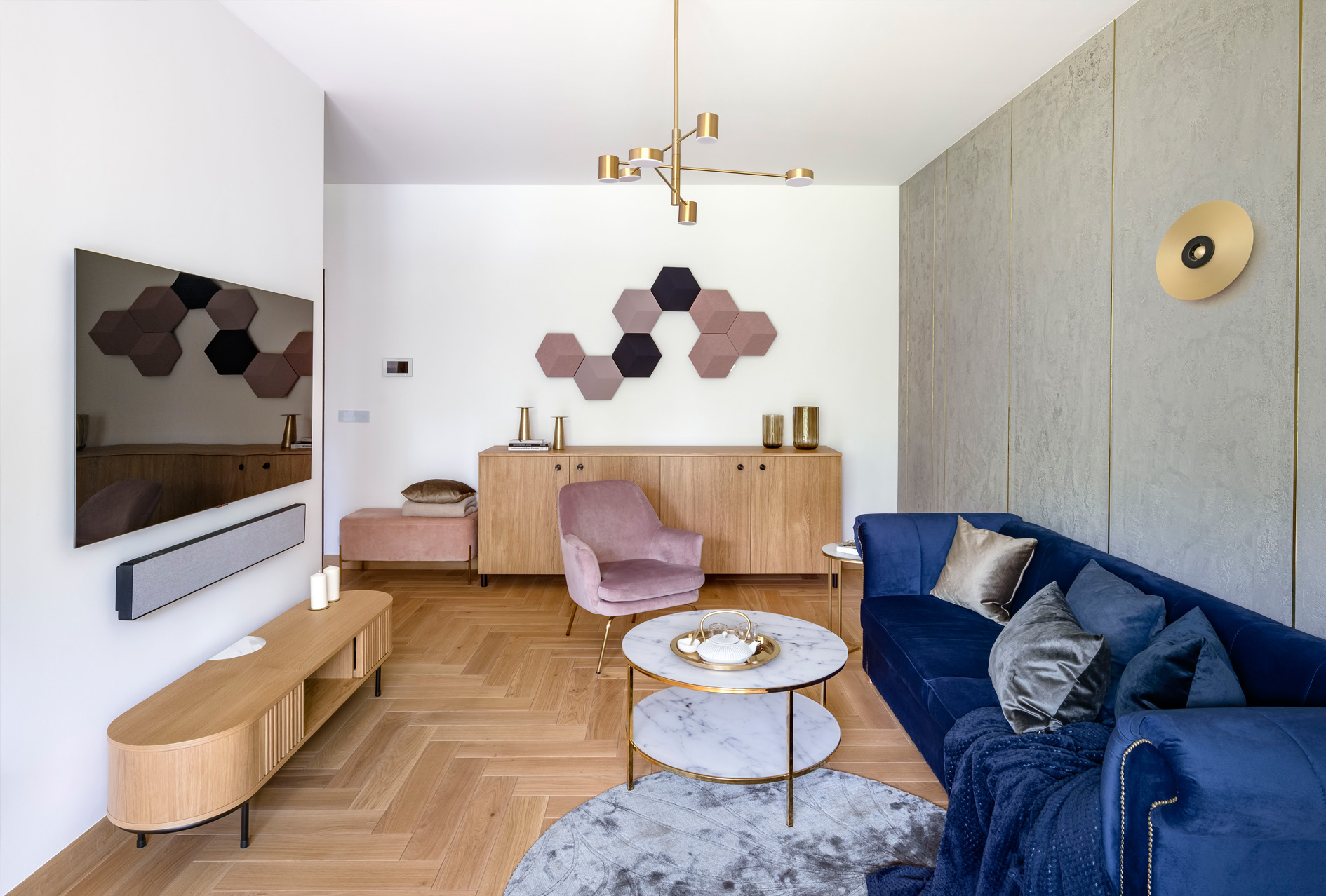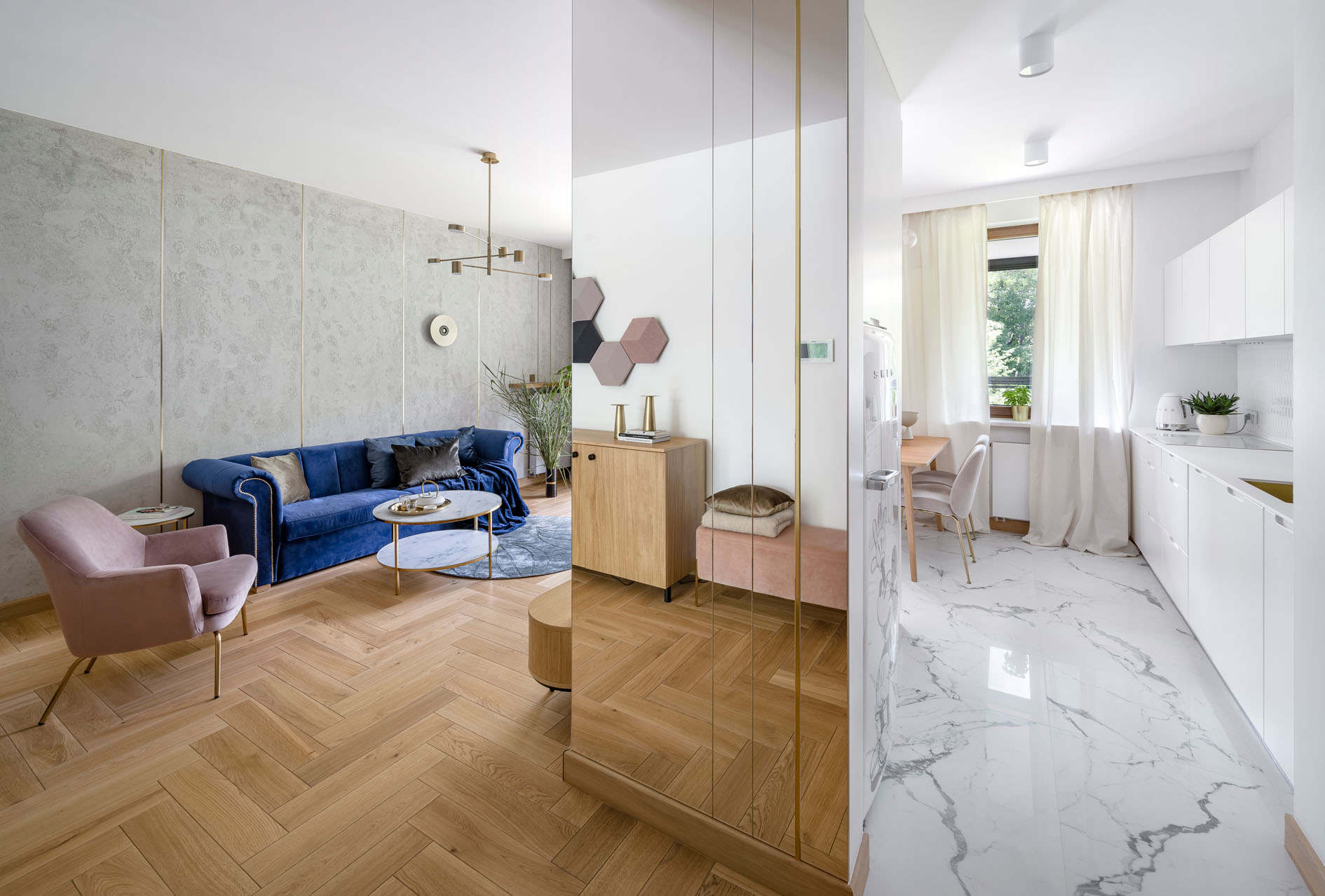 Zealizowany apartament, w którym postawiliśmy na dobre jakościowo materiały, spójną przestrzeń i ciekawe dodatki. Salon połączony z aneksem to jasne wnętrze ze złotymi dodatkami , które przewijają się w każdym pomieszczeniu. Naturalne drewno na podłodze w połączeniu z tynkiem dekoracyjnym na ścianie oraz granatową sofą tworzą zamkniętą kompozycję łączącą tony ciepłe i chłodne. Uzupełnieniem są beżowe , różowe elementy. Łazienka to połączenie zieleni z szarością i złotem. Sypialnia, w podobnym tonie- połączenie chłodniejszego błękitu z drewnem oraz złotymi dodatkami.