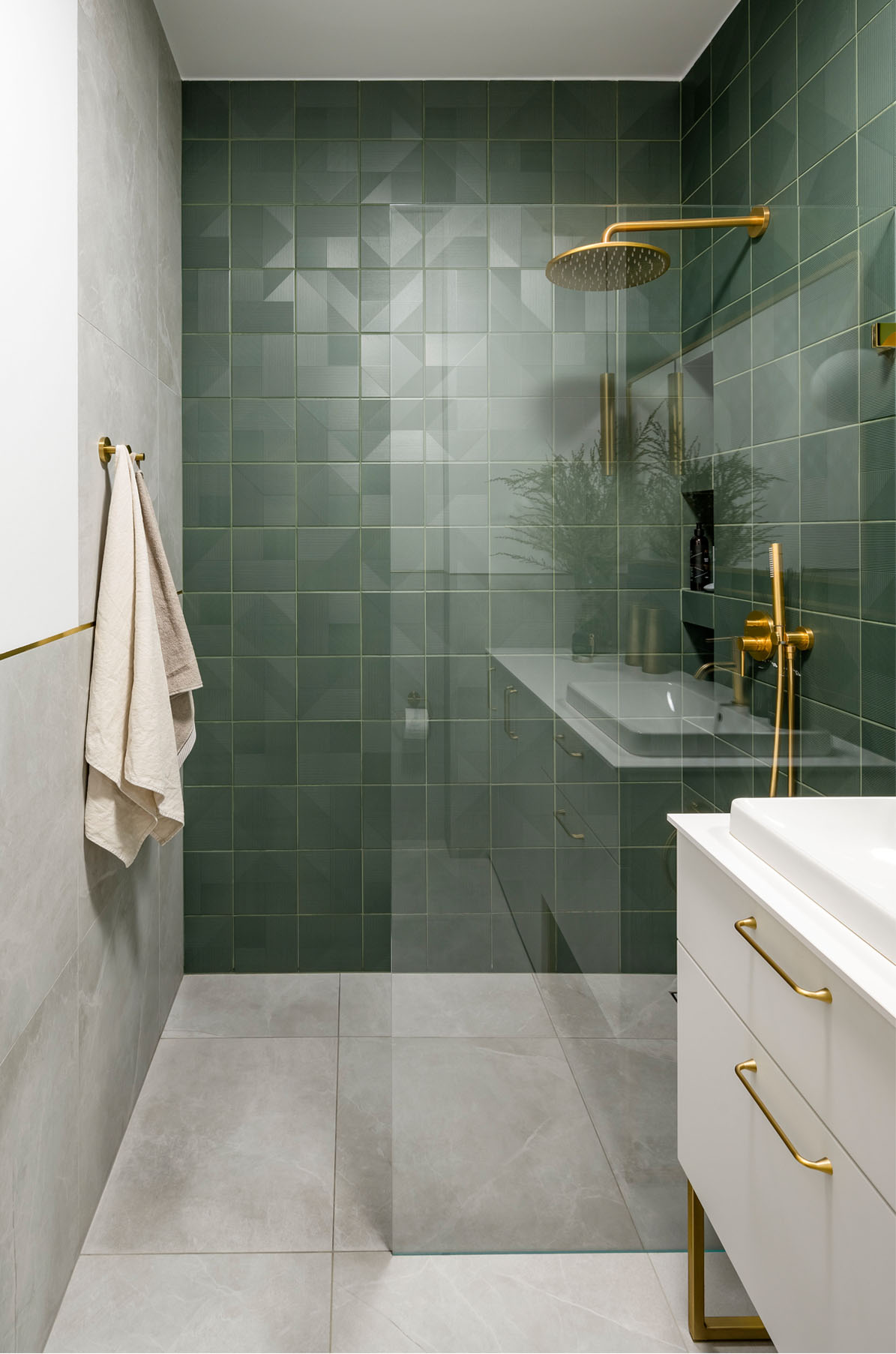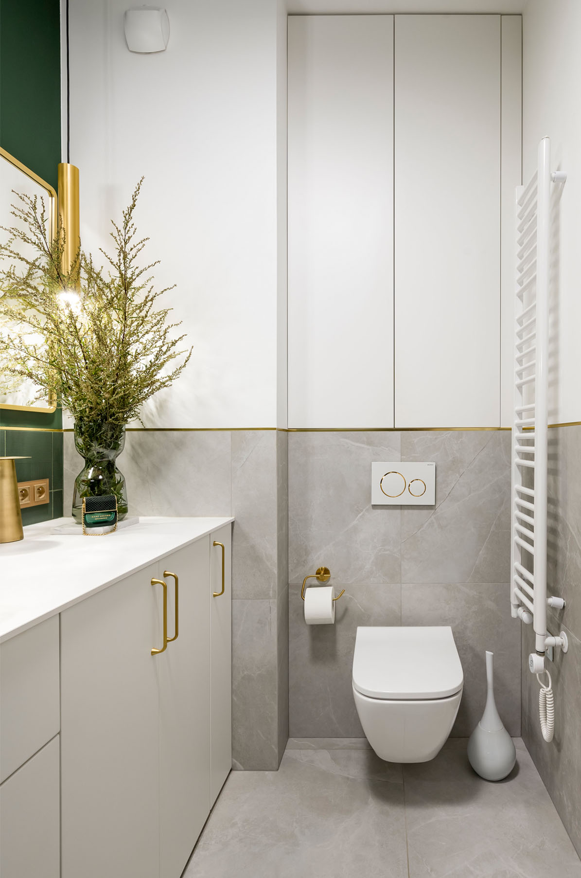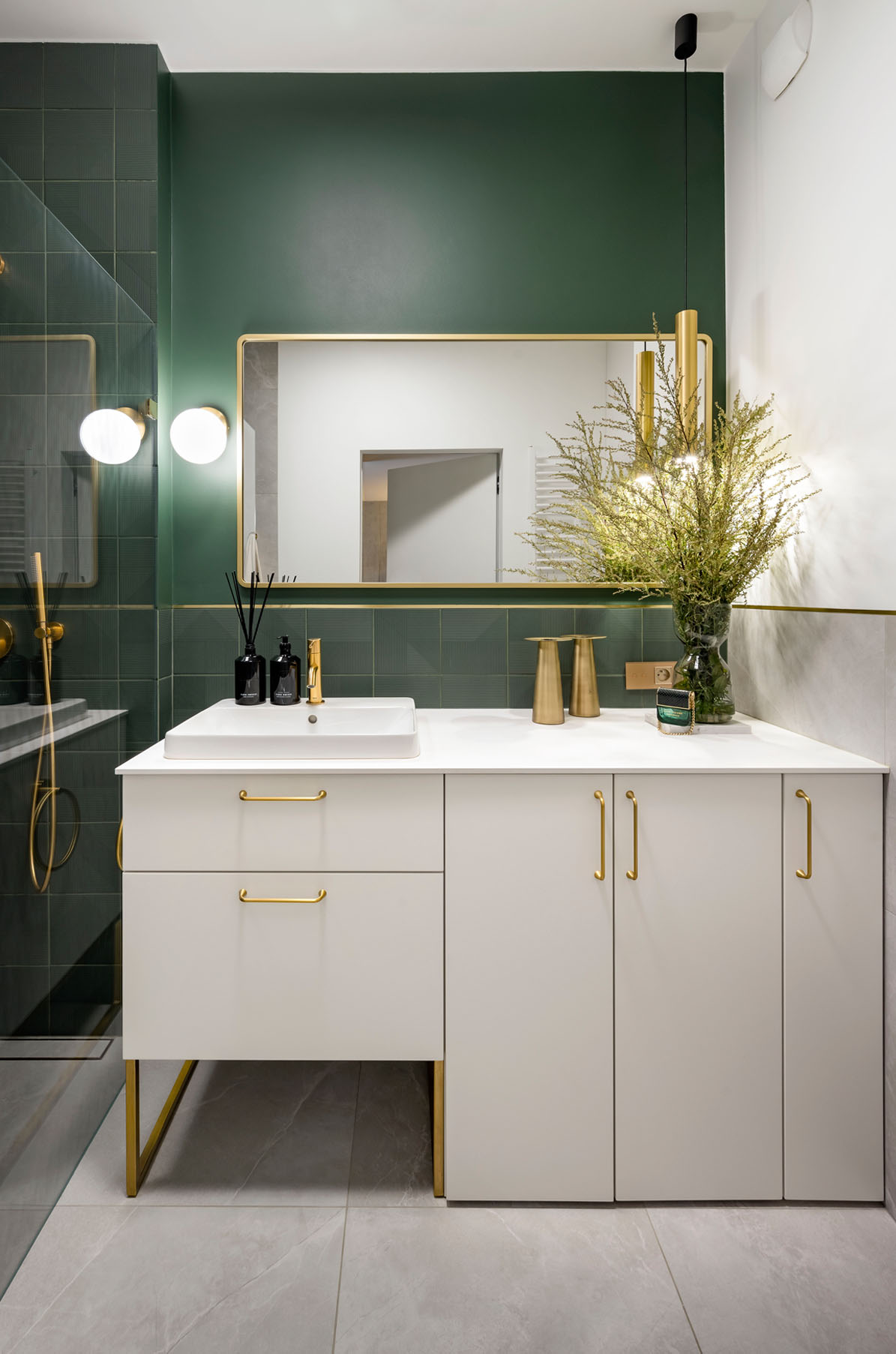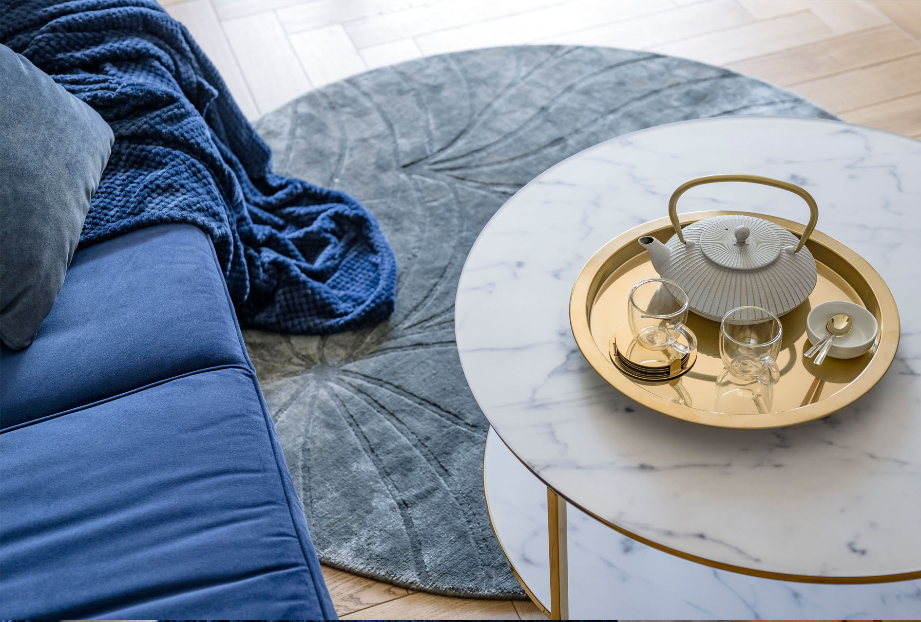 Zealizowany apartament, w którym postawiliśmy na dobre jakościowo materiały, spójną przestrzeń i ciekawe dodatki. Salon połączony z aneksem to jasne wnętrze ze złotymi dodatkami , które przewijają się w każdym pomieszczeniu. Naturalne drewno na podłodze w połączeniu z tynkiem dekoracyjnym na ścianie oraz granatową sofą tworzą zamkniętą kompozycję łączącą tony ciepłe i chłodne. Uzupełnieniem są beżowe , różowe elementy. Łazienka to połączenie zieleni z szarością i złotem. Sypialnia, w podobnym tonie- połączenie chłodniejszego błękitu z drewnem oraz złotymi dodatkami.