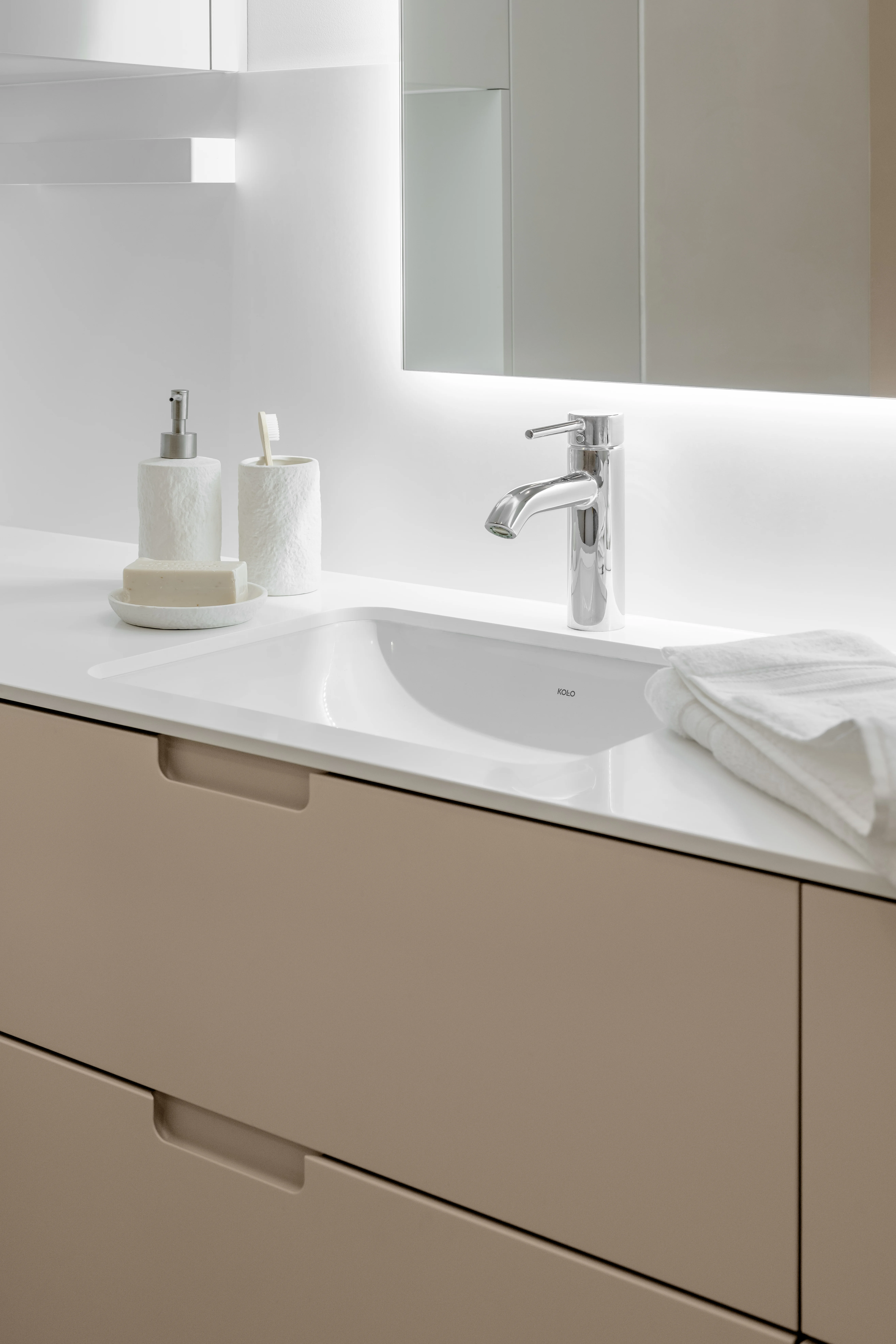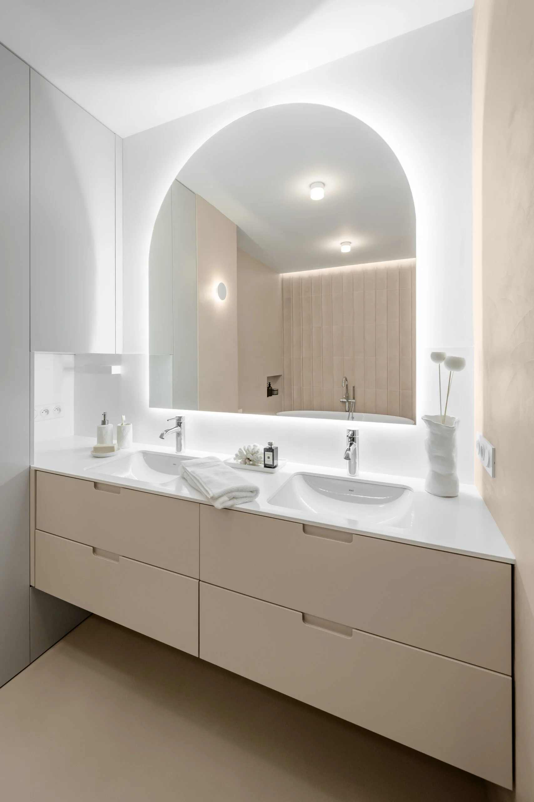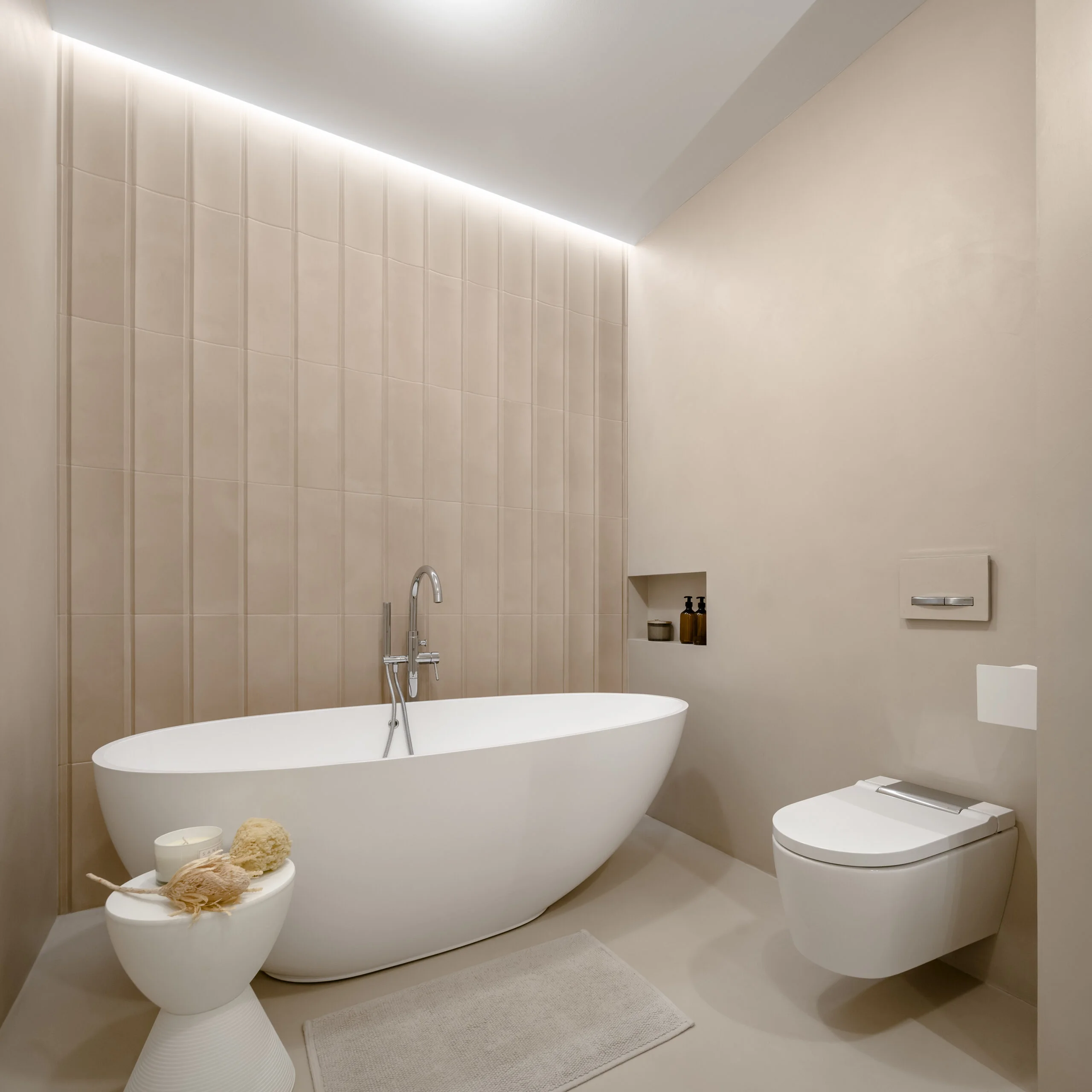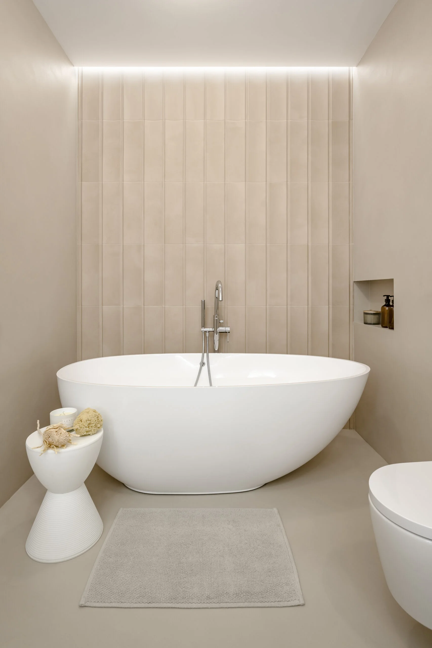 Łazienka na piętrze to pokój kąpielowy, zdominowana przez beżowy mikrocement. Dekoracyjnym akcentem są płytki 3D o piaskowej fakturze, które dodają głębi i tekstury. W łazience znalazło się miejsce na wolnostojącą wannę, podwójną umywalkę oraz zabudowę stolarską w kolorze mikrocementu, co podkreśla minimalistyczny charakter wnętrza.