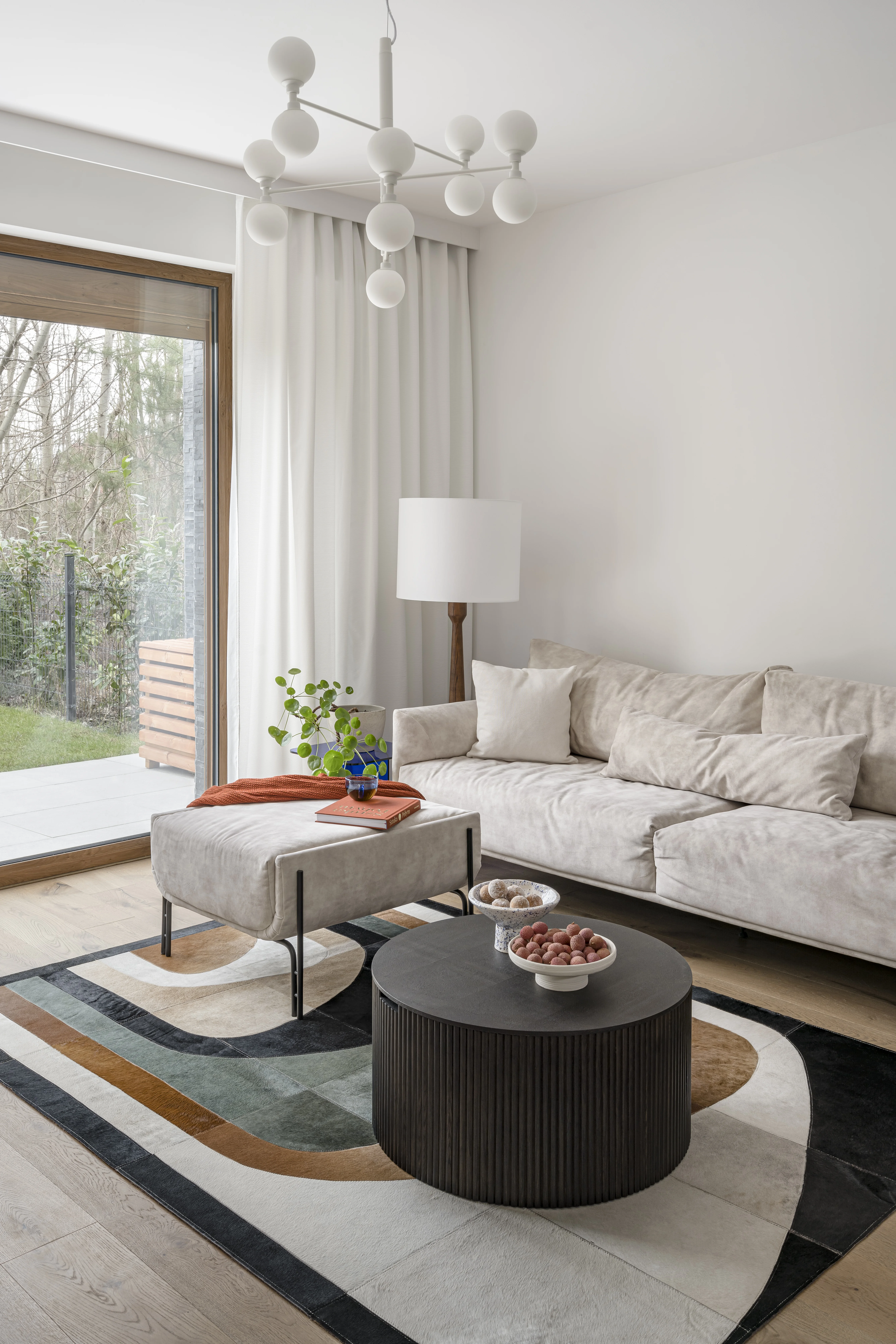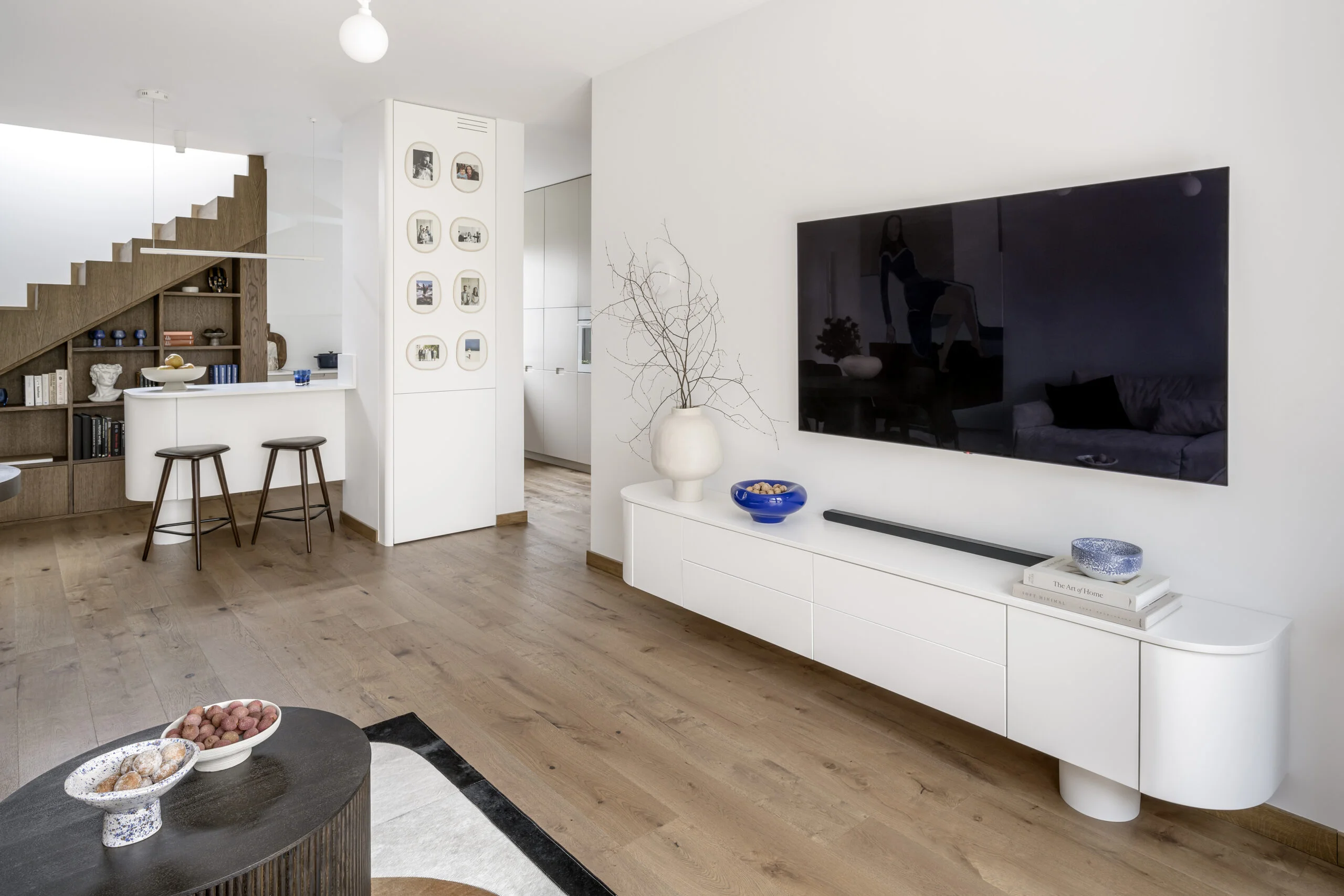 Drugim założeniem projektowym była zabawa formą – mocne, geometryczne kształty schodów, zabudowy pod schodami oraz proste kąty ścian zostały przełamane przez obłe formy mebli. Wyspa kuchenna, szafka telewizyjna, krzesła, stół oraz oświetlenie wprowadzają do wnętrza organiczne, miękkie linie, tworząc harmonijny kontrast z surową geometrią.