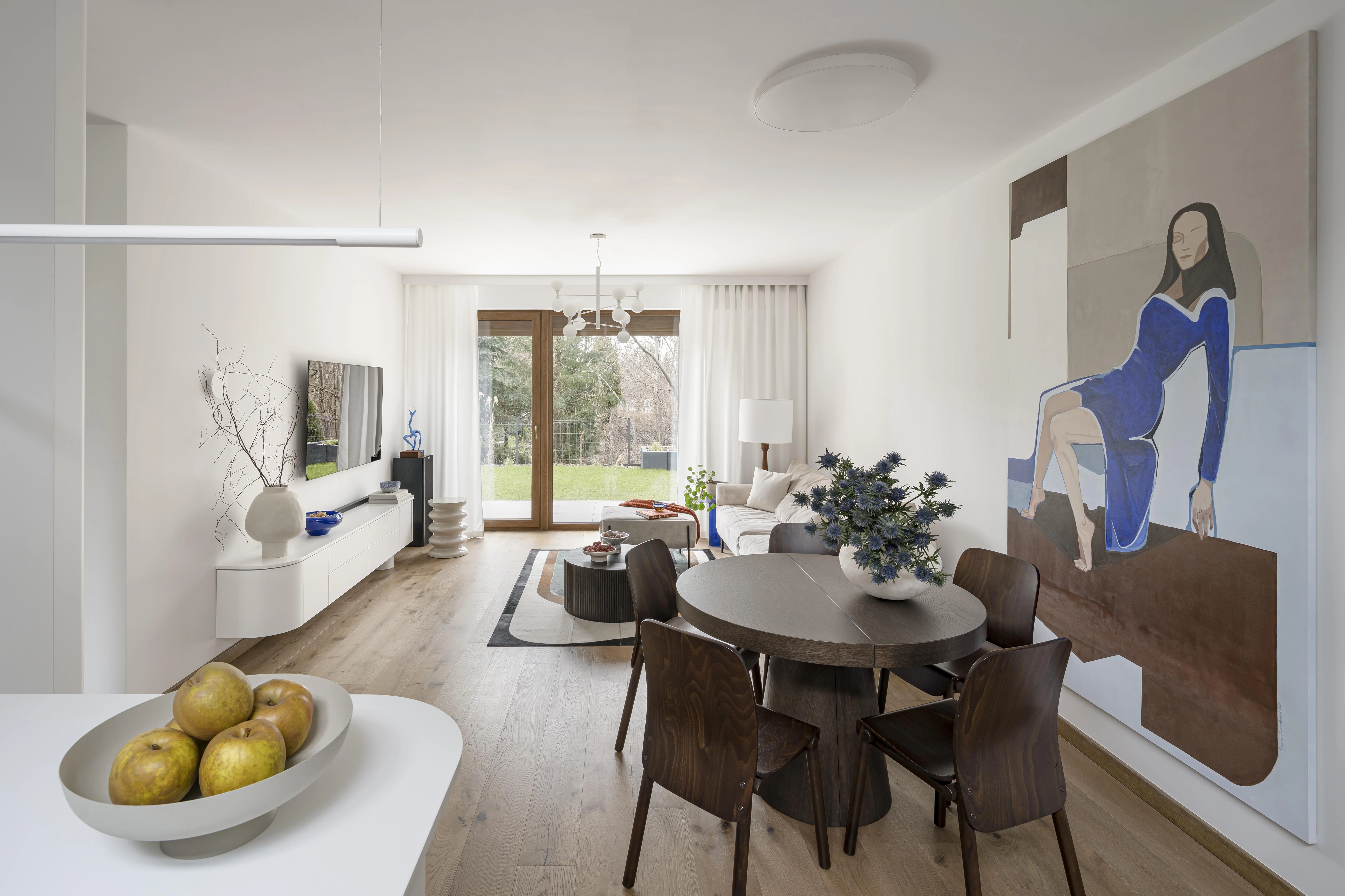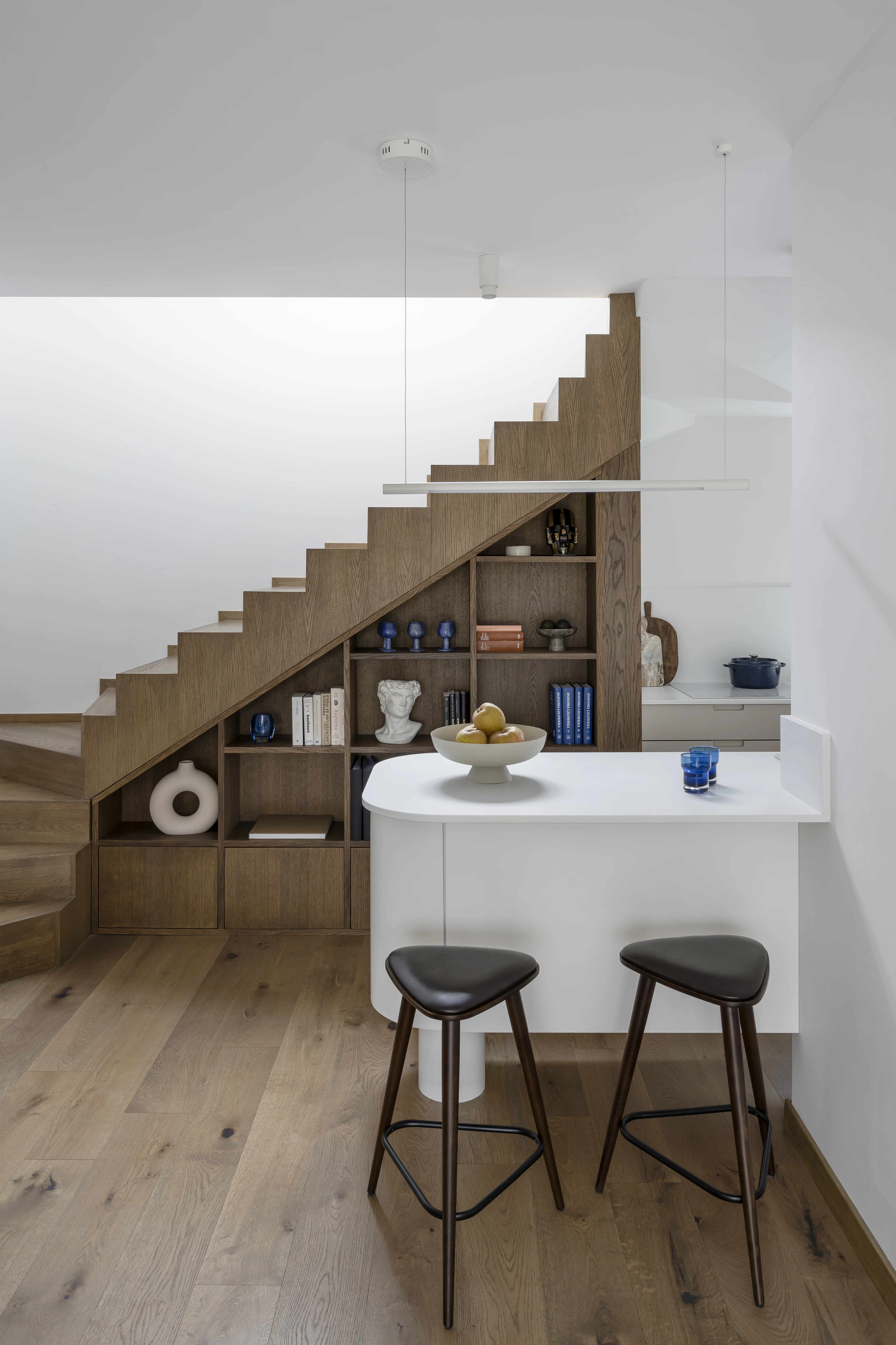 105-metrowy apartament nawiązuje do stylistyki Bauhaus. Głównym założeniem projektowym było stworzenie przestrzeni spójnej stylistycznie, ale jednocześnie elastycznej, pozwalającej na rearanżację oraz wzbogacanie jej nowymi elementami, takimi jak sztuka, galerie zdjęć czy pamiątki z podróży. Sercem wnętrza jest otwarta strefa dzienna, łącząca salon z aneksem kuchennym. Dominują tu dwa główne materiały: drewno w ciemnym odcieniu, obecne na podłodze, schodach, zabudowie pod schodami oraz w meblach wolnostojących, oraz biel, która wypełnia ściany, zabudowy i sufit, nadając przestrzeni lekkość i jasność.