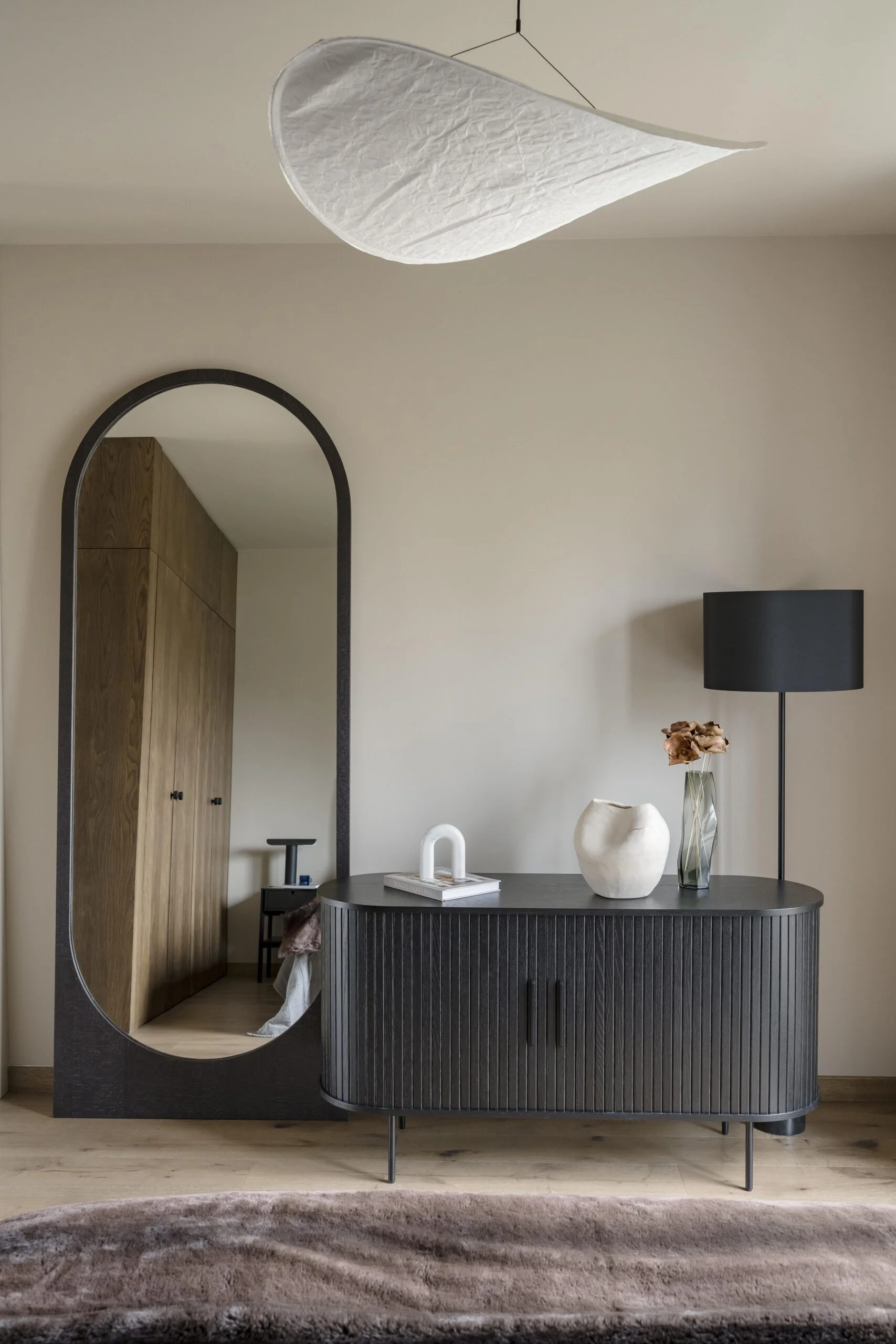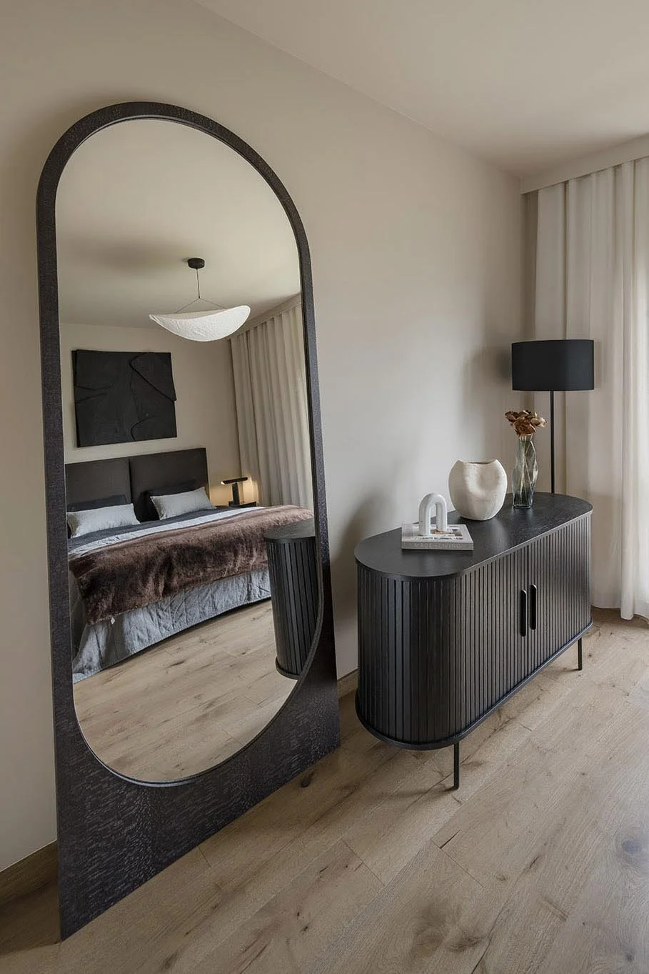 Sypialnia główna to najciemniejsze pomieszczenie w apartamencie, utrzymane w stonowanej, eleganckiej kolorystyce. Mocnym akcentem jest fornir na szafie oraz ścianie, w tonie podłogi, z wyraźnym usłojeniem i szczotkowaniem. Tapicerowane łóżko w ciemnobrązowym odcieniu, czarna komoda, lustro w autorskiej ramie oraz obraz nad łóżkiem dopełniają aranżację.